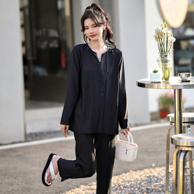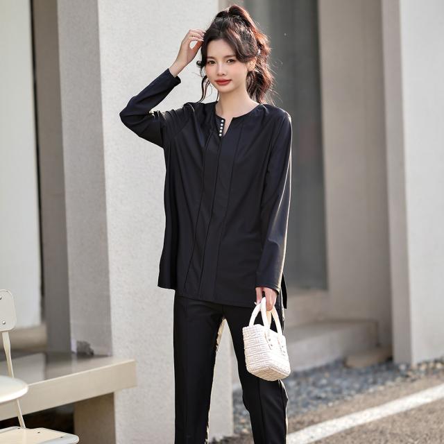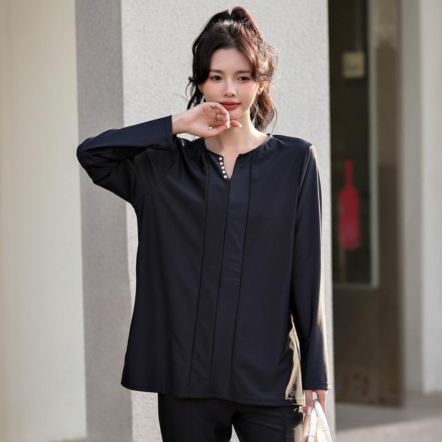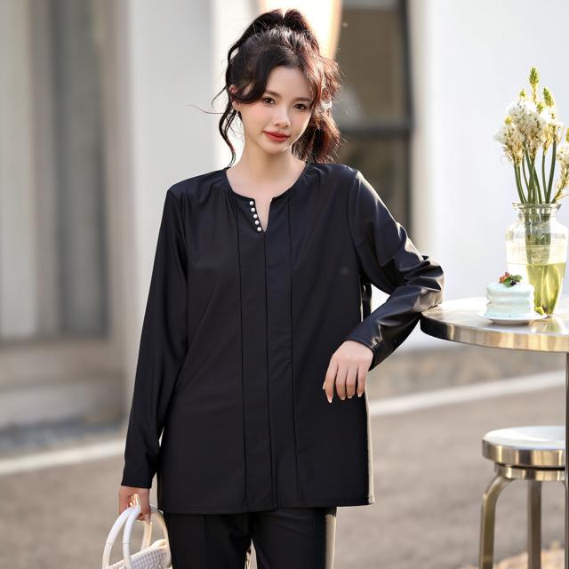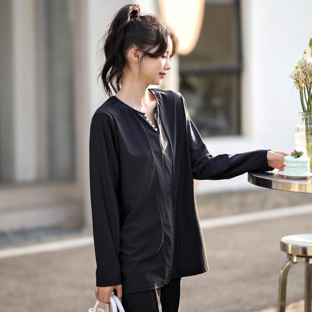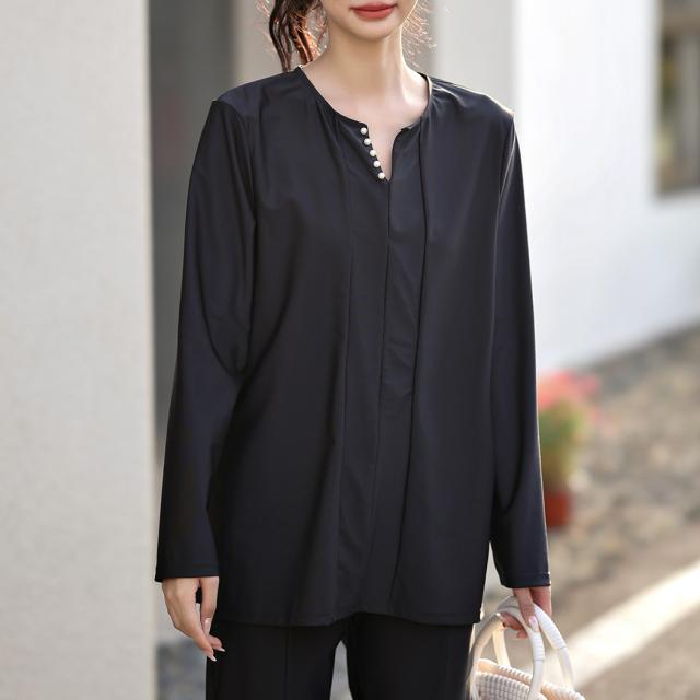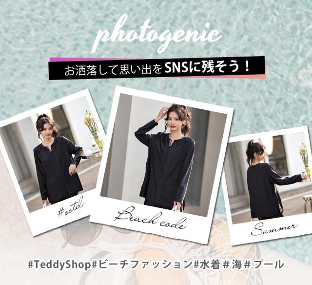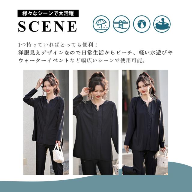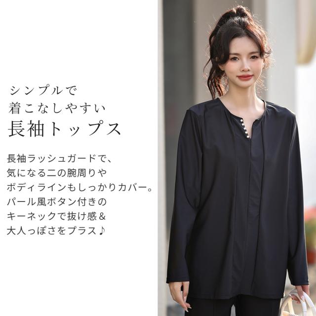ラッシュガード レディース おしゃれ 長袖 フードなし トップス 体型カバー 水陸両用 かわいい ゆったり 黒 無地 水着上 パール風 キーネック センターライン スリット ママ 二の腕 ウエスト ヒップ カバーアップ 伸縮性 ストレッチ 紫外線対策 普段使い フェミニン 水遊び