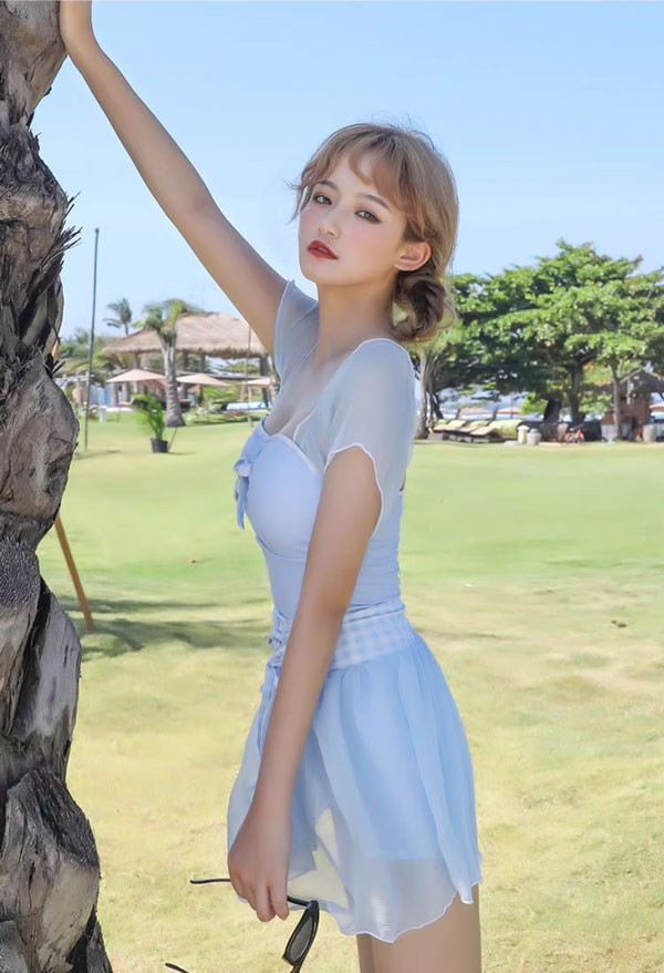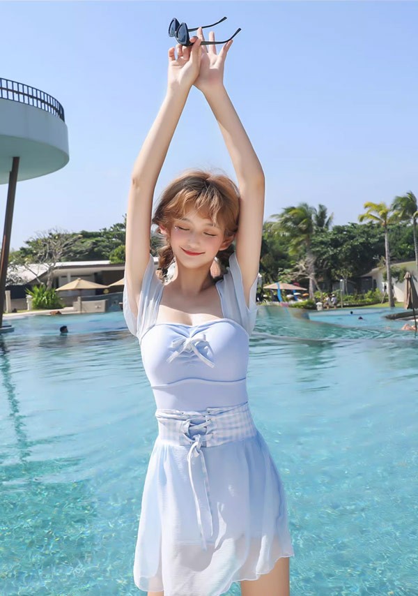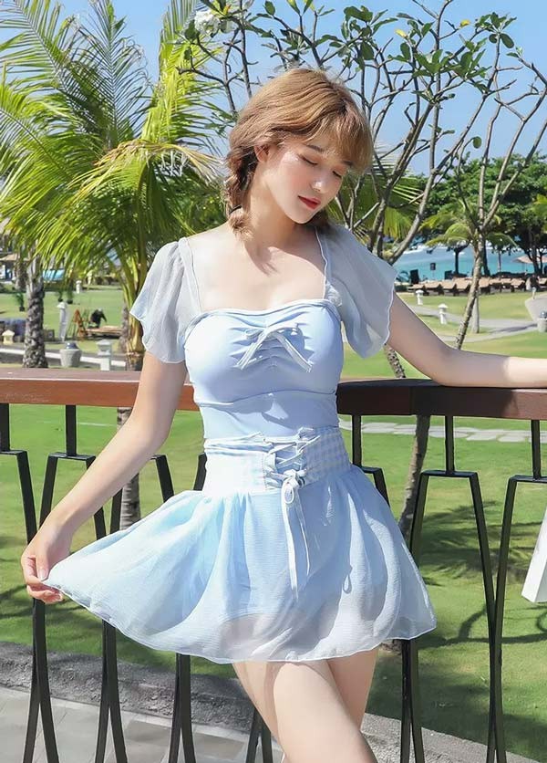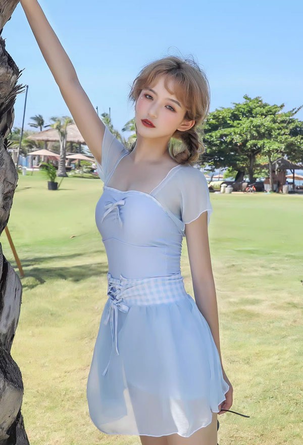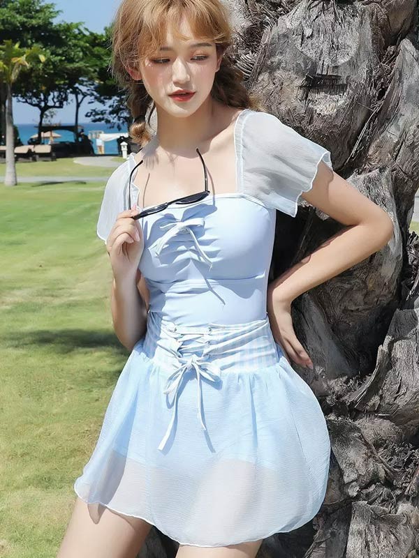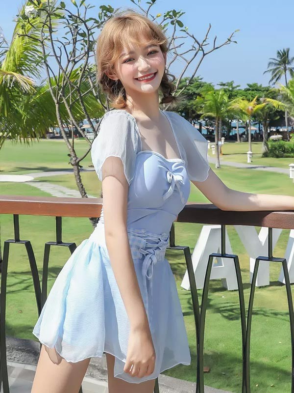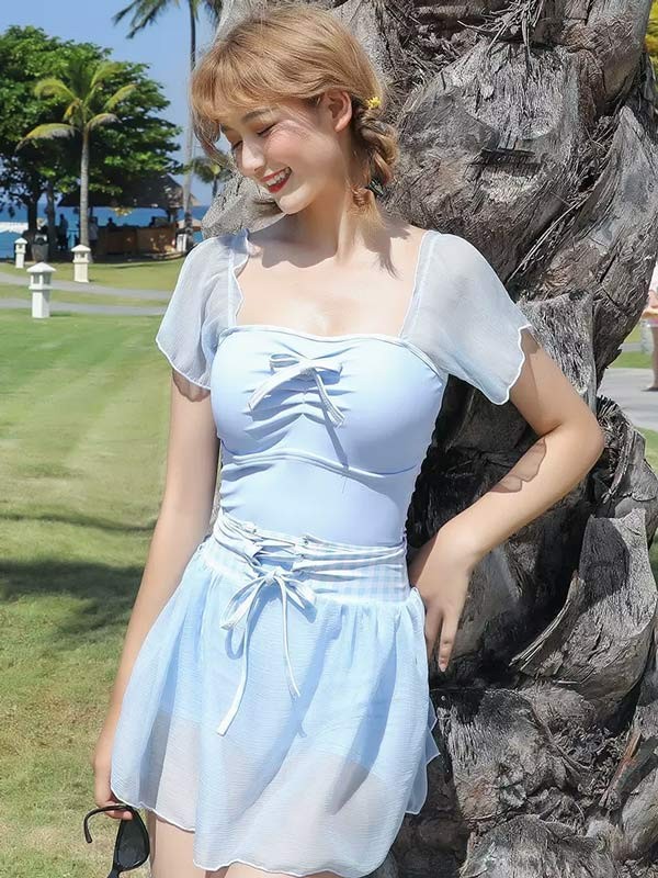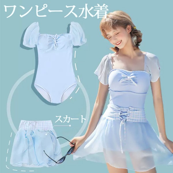 【レビュー投稿で+5%還元】ワンピース水着 水着 2点セット リボン 半袖 スカート ワイヤーなし パッド付 レディース 着?せ シンプル セクシー 写真映え 撮影用 海 夏 サマー プール リゾート かわいい 旅行 温泉 大人 女性用 ジュニア 学生 女の子