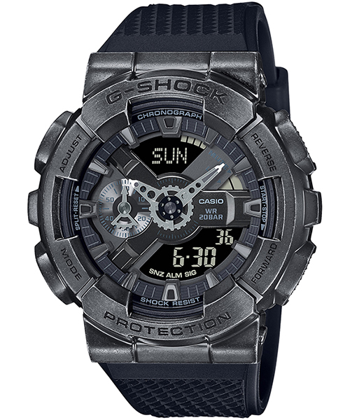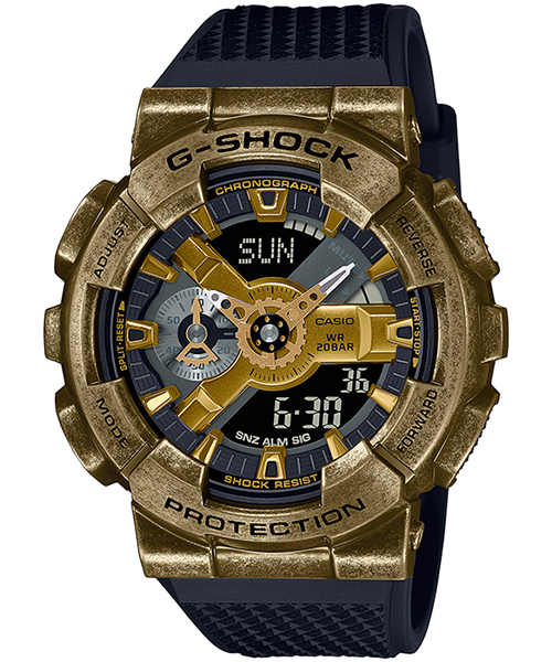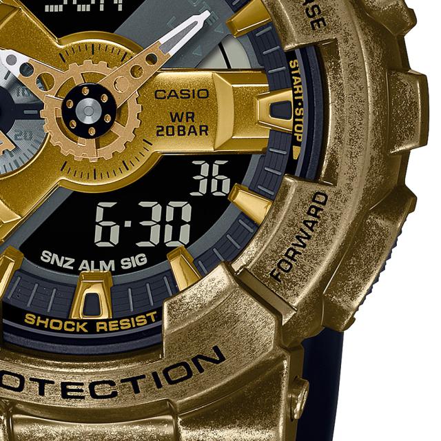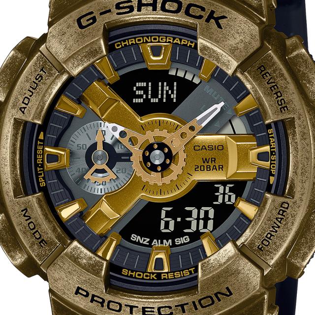 ベースモデルには、メタルカバードのビッグケースGM-110を採用しています。メタルカバードシリーズでは初となる、ゴールドAGED IPを採用し、STEAMPUNKの世界で表現されている使いこまれた真鍮のような質感に仕上げました。また、GA-110の歯車をモチーフにした時分針のデザインを踏襲し、人気のビッグケースモデルのタフさを表現しています。カジュアルシーンでアクセントになるクールなデザインです。