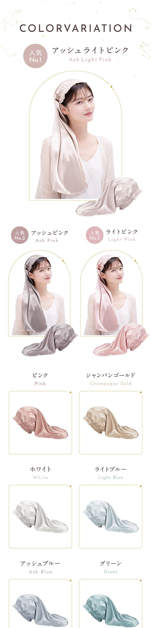 またシルクには天然の防菌作用があり、気になる髪の匂いを防ぎます。寝ぐせ防止にも効果があります。