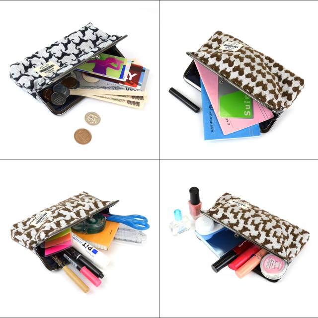 犬のがま口バンクポーチです。通帳やカード、印鑑などしっかりと管理したい大切な貴重品をきちんとまとめて保管できるポーチです。使い勝手のいい“がま口”式を採用しお財布のようなデザインなので、持ち歩いても違和感はありません。保管用のケースとしてはもちろん、パスポートを収納してトラベルポーチやコスメポーチなど使い方は色々です。ファスナー式と異なり、ワンタッチで開け閉めでき、ストレスなく使えます。生地は、内外どちらも西陣織のオリジナルファブリック。裏地は、SAIEIISHOBOのアルファベットを散らしたモダンなデザインで、色は深みのあるネイビーになっています。また、正面右側にはブランドロゴの織りネームが付いています。