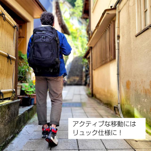 駅や空港など平らな場所でキャリー移動!階段や坂道ではリュックとして背負えます。