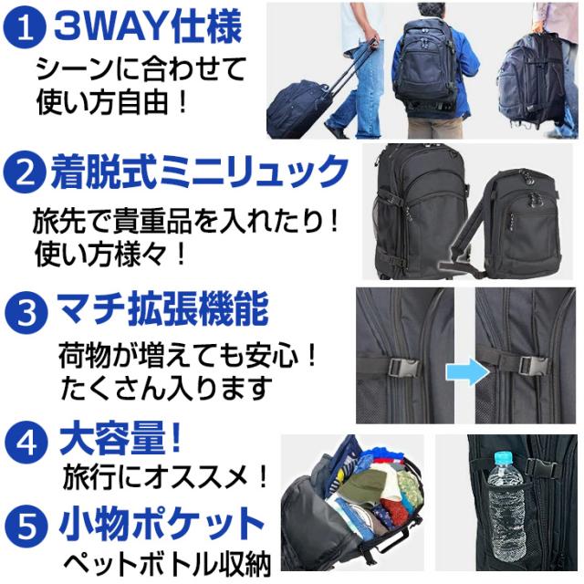 【キーワード】 キャリーバッグ 3WAY仕様 リュック 着脱式ミニリュック トロリーバッグ メンズ 旅行 出張 ビジネス 海外旅行 大容量 マチ拡張 キャリー ファミリー 高機能