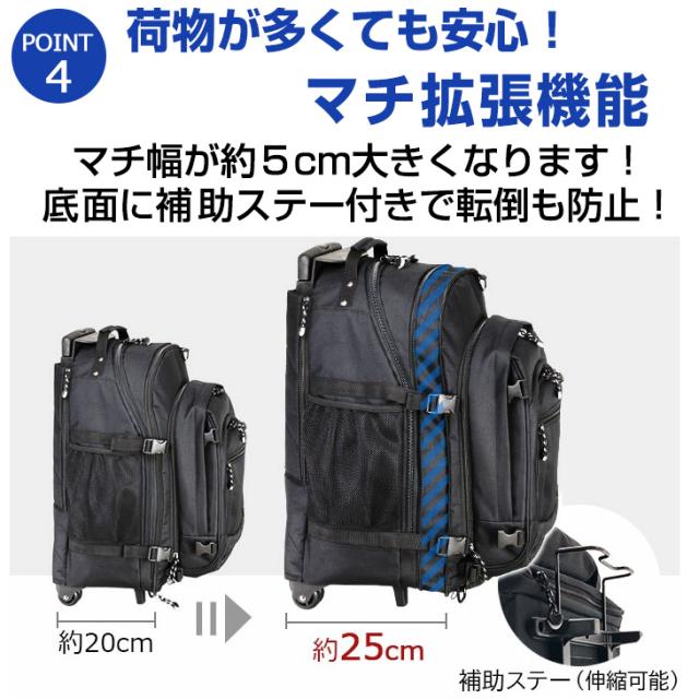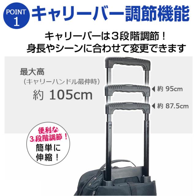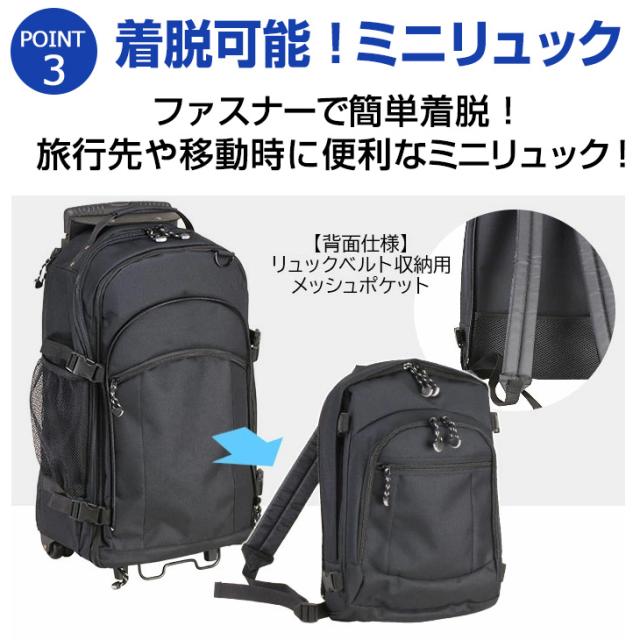 【仕様】ファスナーポケット ネットポケット 取っ手付き リュックベルト キャスターカバー兼用リュックベルト収納仕切り マチ拡張機能 3WAY仕様 3段調節トロリーバー リュックメッシュポケット