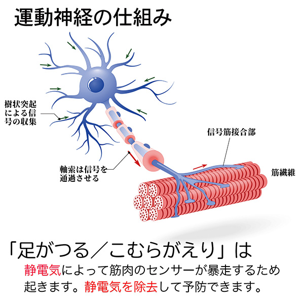 足がピキーンとなるのは、筋肉の神経センサーと、脊髄等中枢との電気信号のやりとりの不具合で、筋肉が異常に収縮することで起こります。脚ツランTMメッシュはセンサーに影響する静電気を除去する効果(有機導電繊維による除電効果)があります。