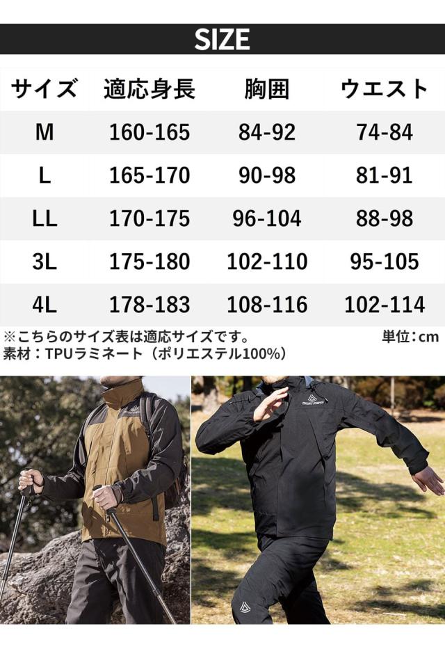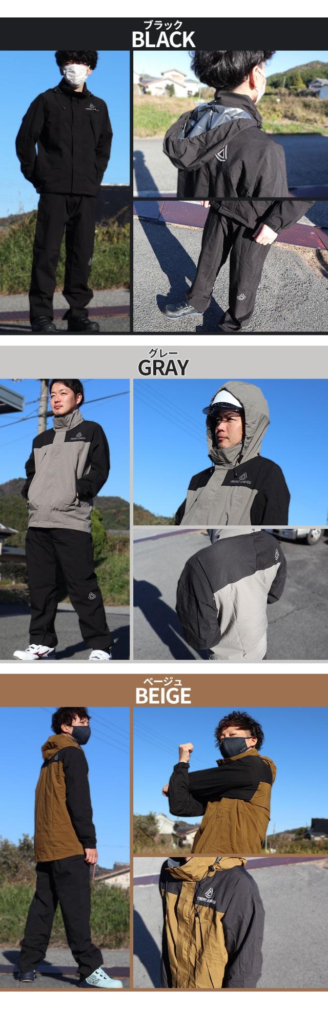 ・上着は水の侵入を防ぐ前たて、収納可能な立体フード(調整ひも付)、裾部分には絞りヒモ付で下からの雨・風の侵入をブロックします。