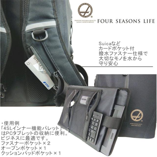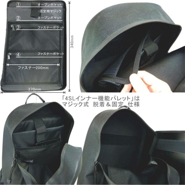 「4SLインナー機能パレット」はクッションパッド入りでA4ファイル・タブレットなどの収納に適しています。その他にもファスナーポケットが2箇所、オープンポケットが1箇所、全部で4箇所のポケット仕様。