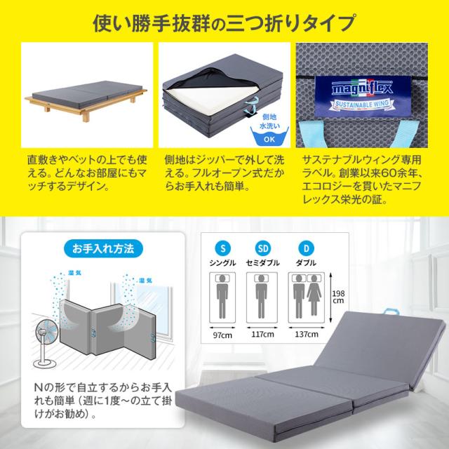 サステナブルウィング セミダブル マニフレックス 【 7年 保証 正規店 】 マットレス 三つ折り 117×198×10cm イタリア製 敷き布団 やや 硬め メッシュウィング 類似 正規品 高反発マットレス 腰痛 体圧分散 厚み10cm 長期保証 sustainable magniflex