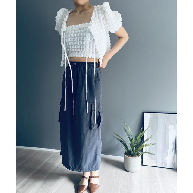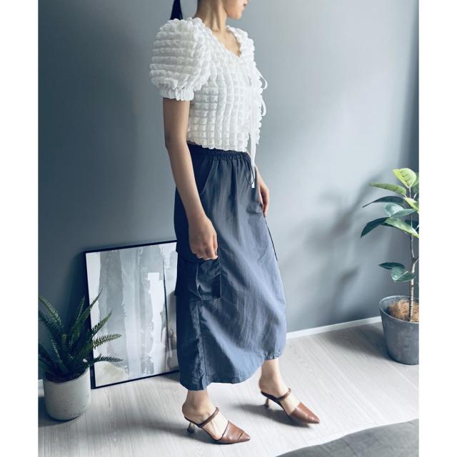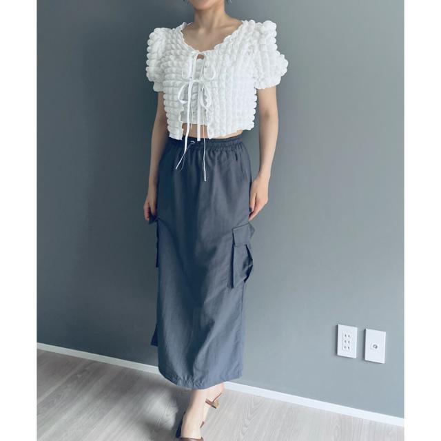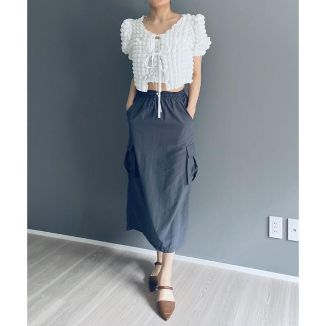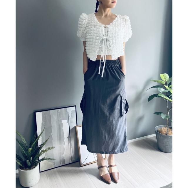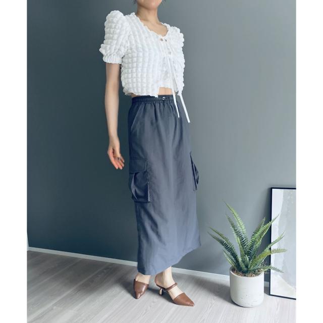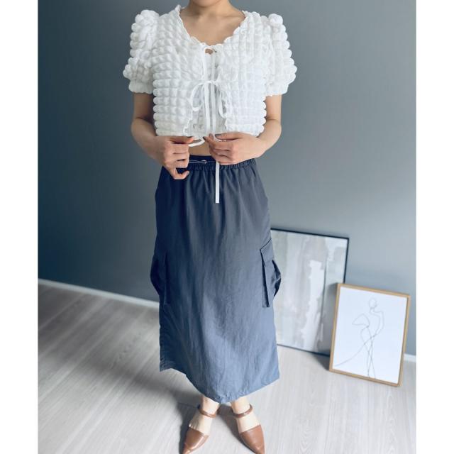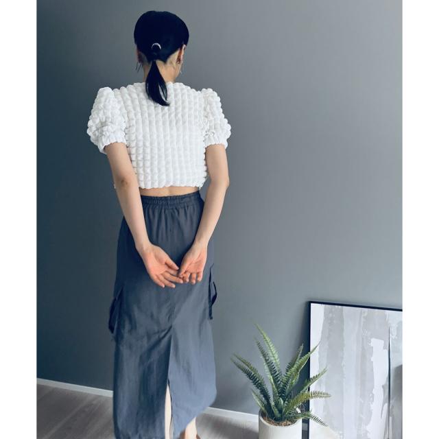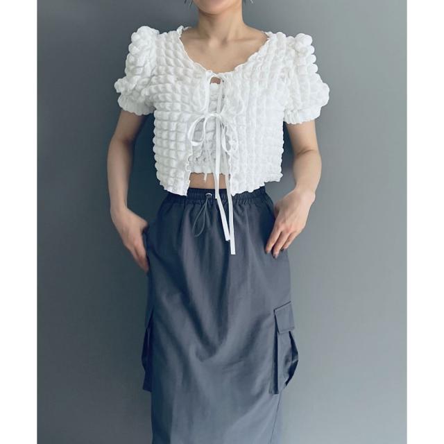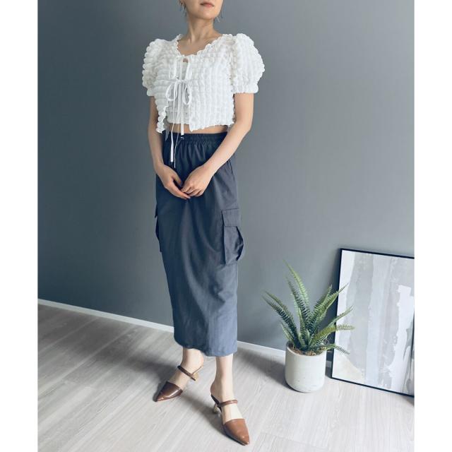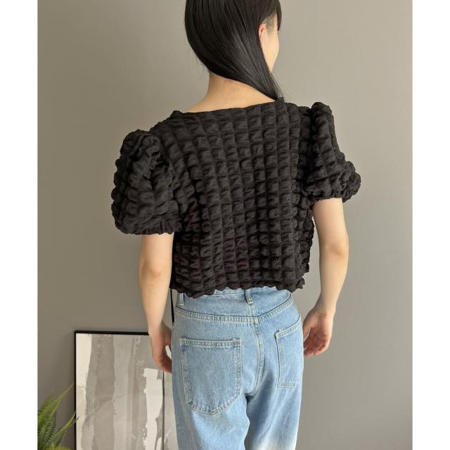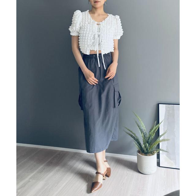 空気を含んだ凹凸が可愛らしいポップコーン素材を使用したアンサンブルです。