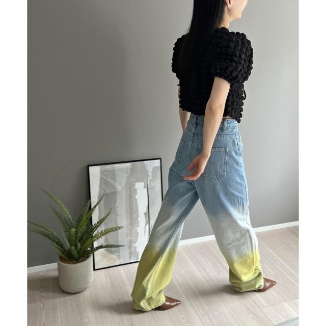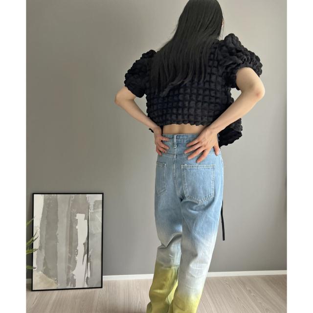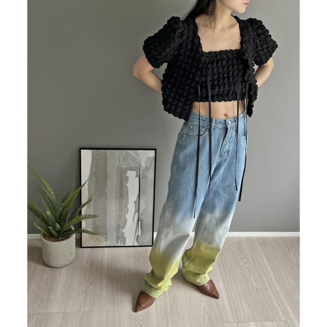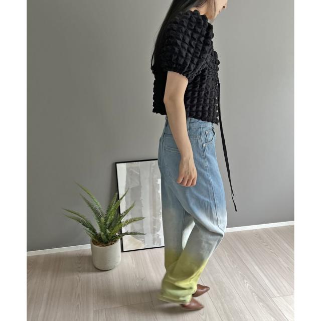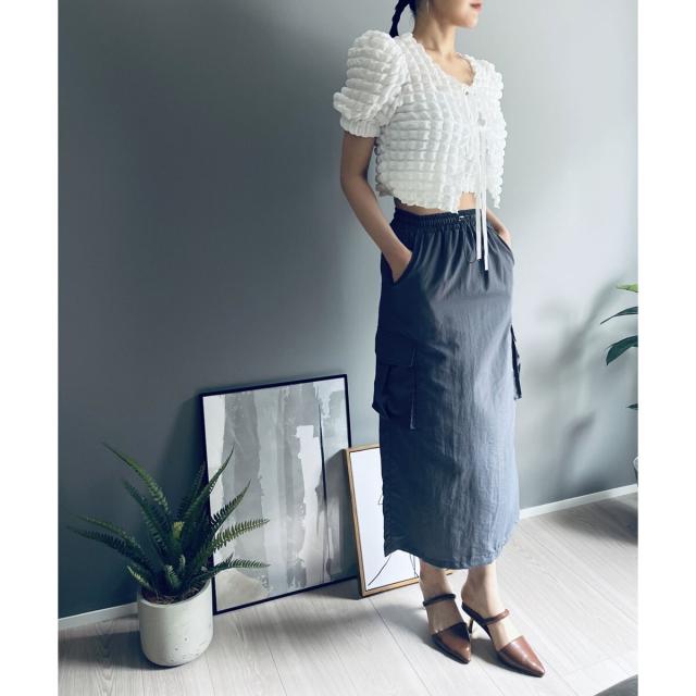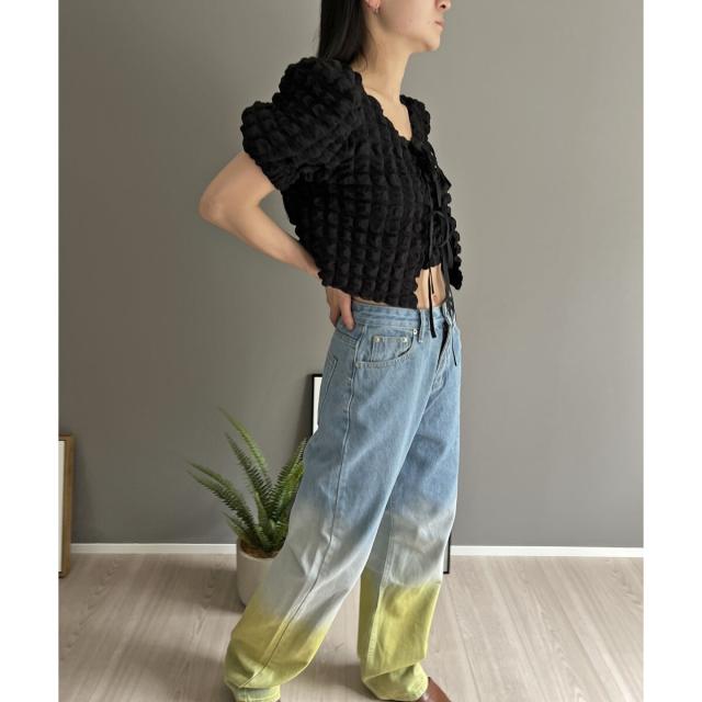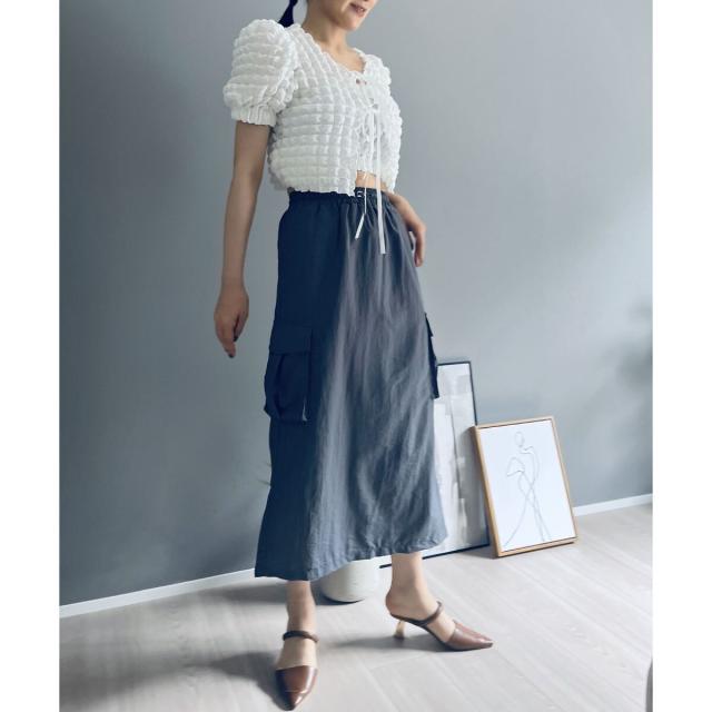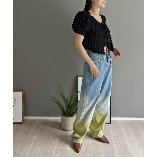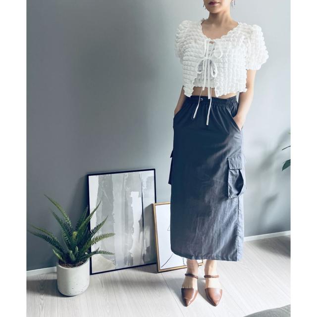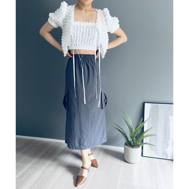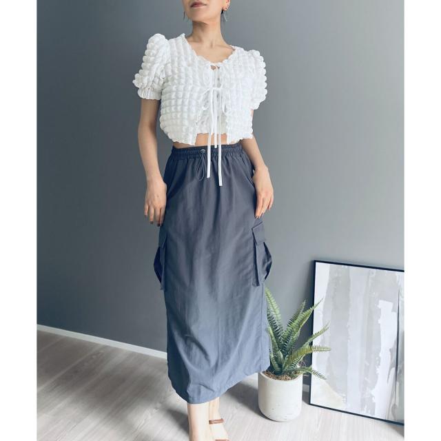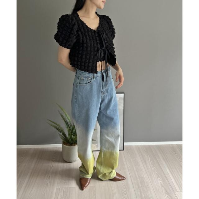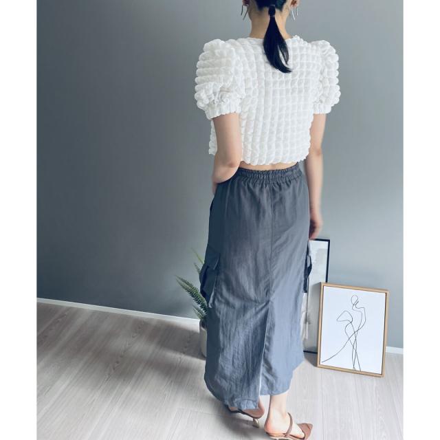 空気を含んだ凹凸が可愛らしいポップコーン素材を使用したアンサンブルです。