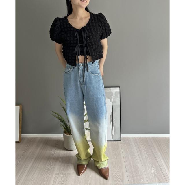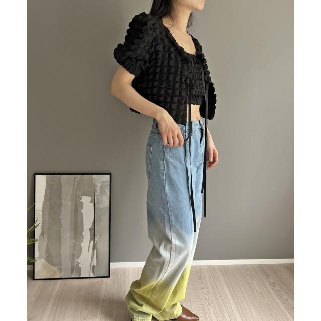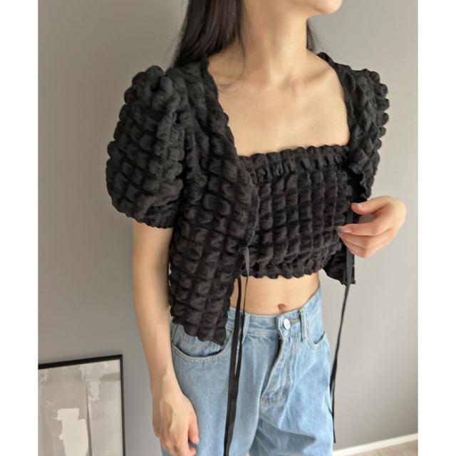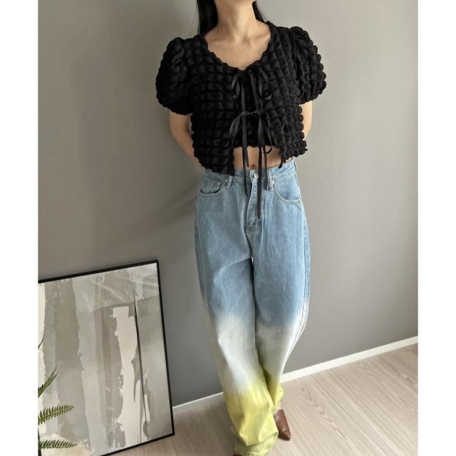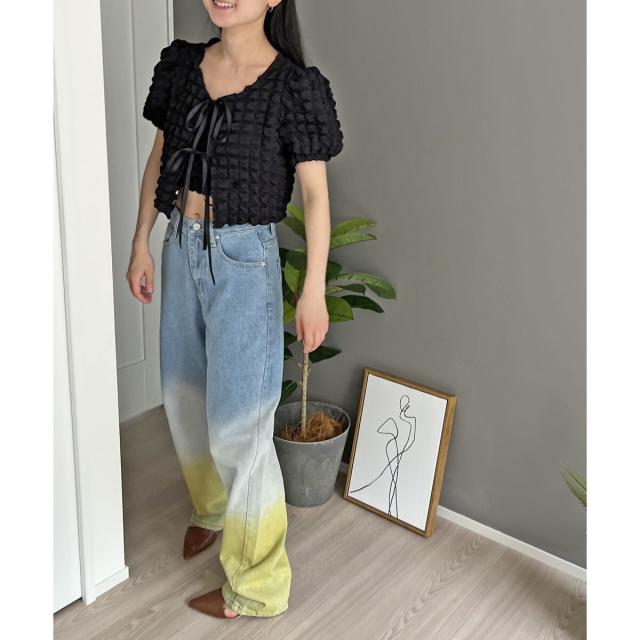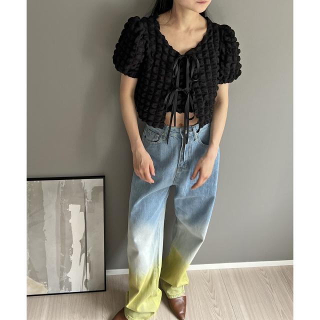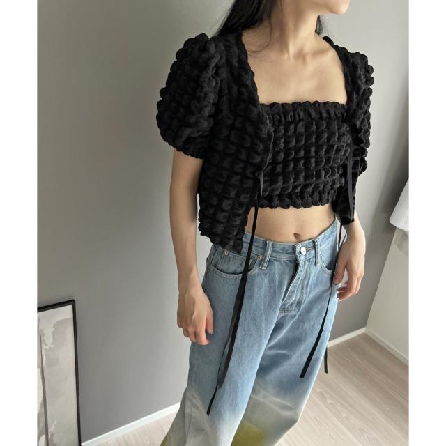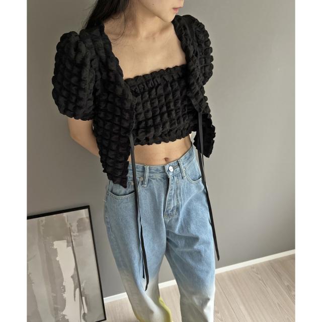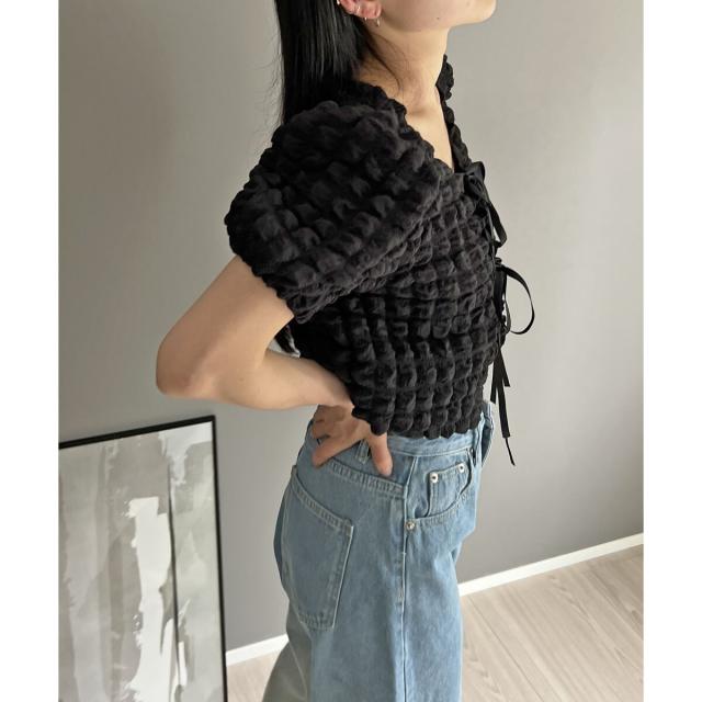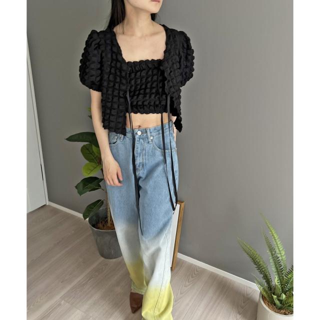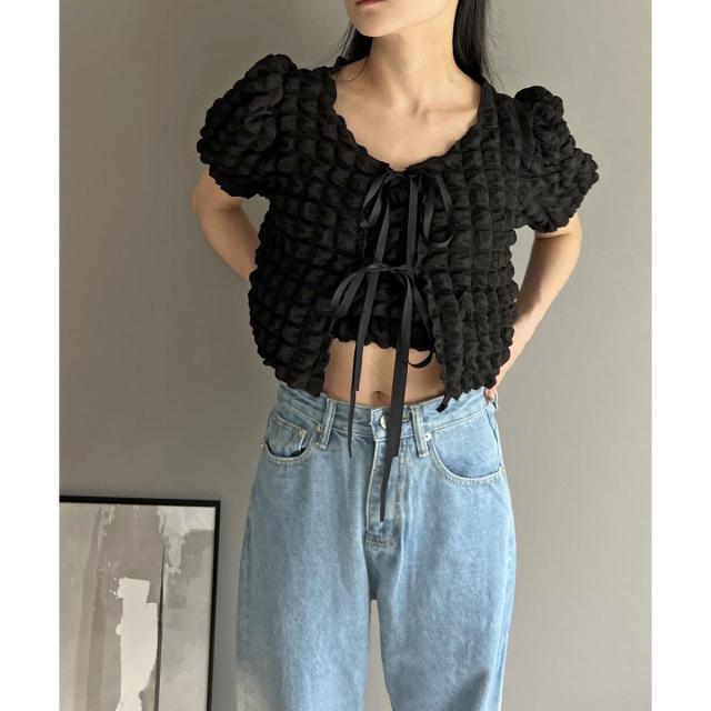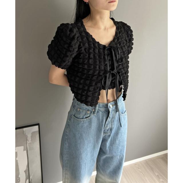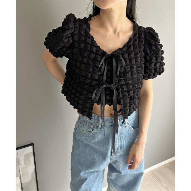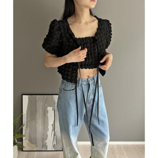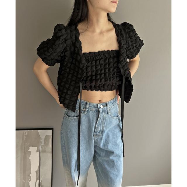リボン結びが愛らしい半袖カーディガンにクロップドのチューブトップをセットにしました。