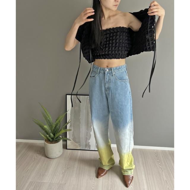 今らしいクロップドのチューブトップはレイヤードアイテムとして活躍します。