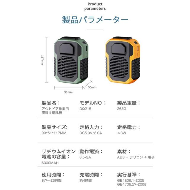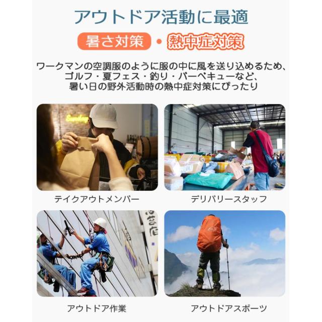 工事現場、農作業、野外作業、釣り、バーベキューなどのアウトドアはもちろん、倉庫、工場などの室内活動にもお薦めです。低モードは涼しい風量が、高モードが強い風量を持っています。