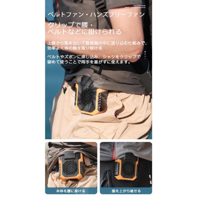 爽やかな涼風は体と服の間に流れ、炎天下でも心を落ち着かせるウエスト携帯扇風機です。ベルトに取付けて腰かけ扇風機として、シャツの裾をクリップで簡単に挟んだら、服内に風を送り込めます。また、ストラップ付き首かけで両手が解放されます。
