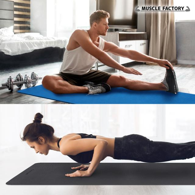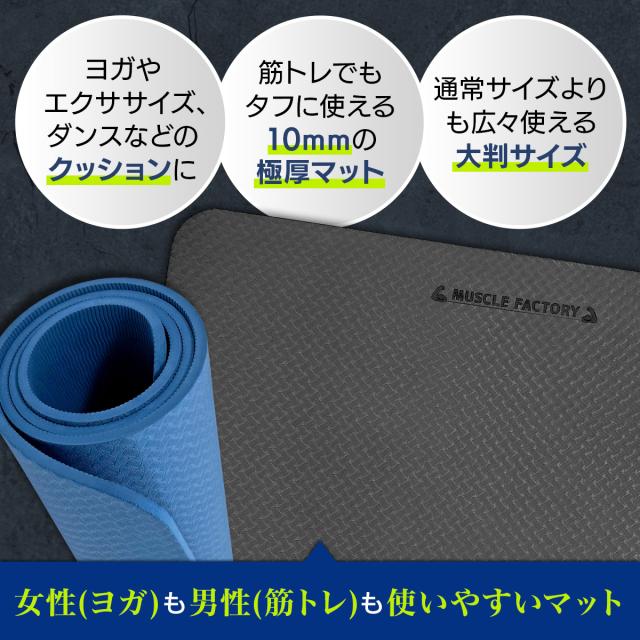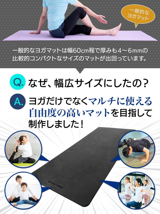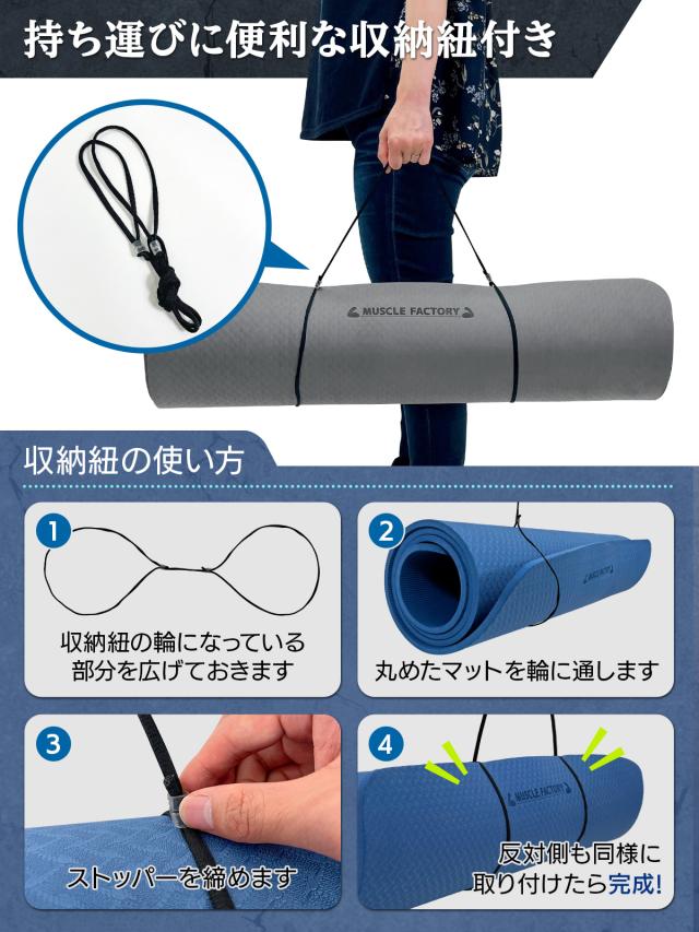 幅広で男性でも余裕のビッグサイズのヨガマット!極厚10mmなので底付き感がなく身体を痛めにくい、筋トレなどトレーニングにも使えるヨガマットです。持ち運びに便利な収納紐付き。