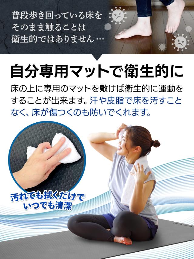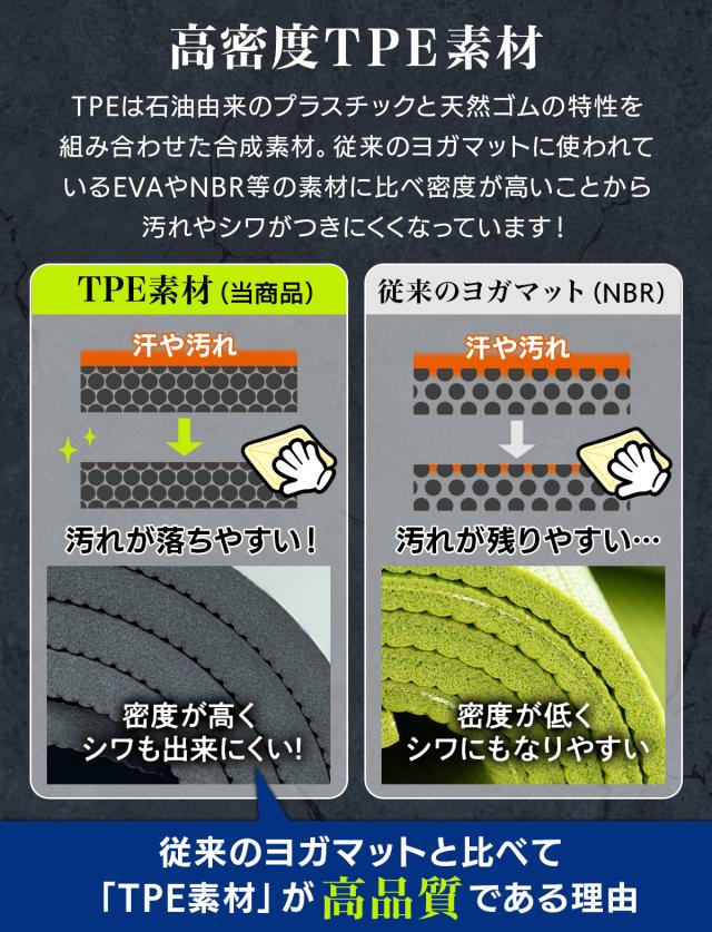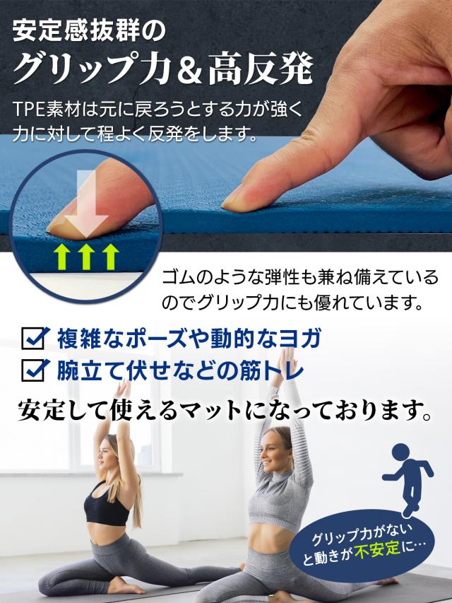 【高品質でグリップ力の高いTPE素材】ポーズやフォームがブレないよう、しっかりとグリップが効く丈夫で柔軟性に優れたTPE素材を採用!さらに防水性にも優れているのでお手入れもサッと拭くだけで済み、衛生的で床も汚さずに済みます。