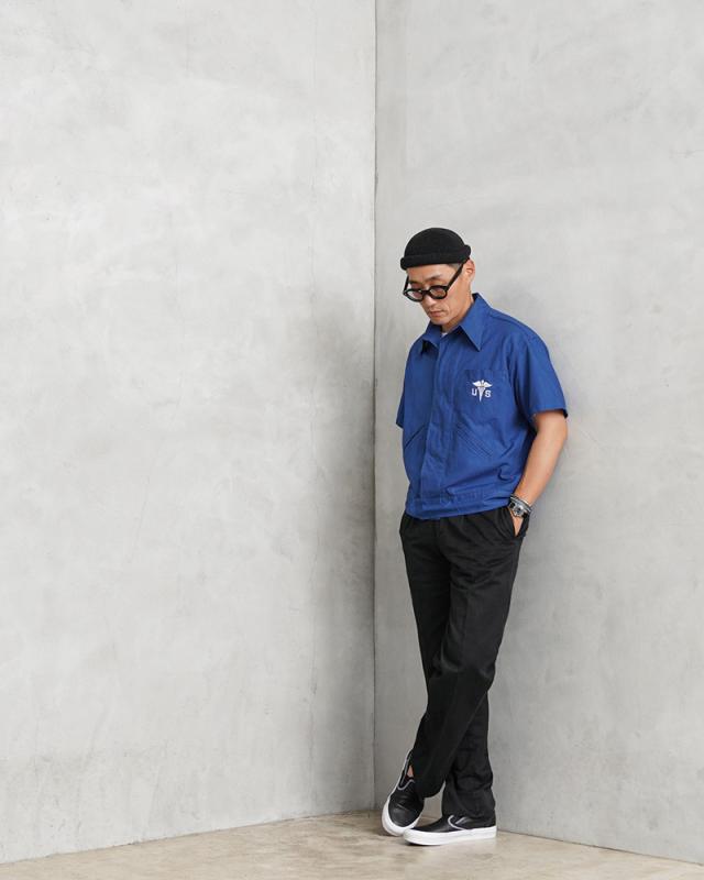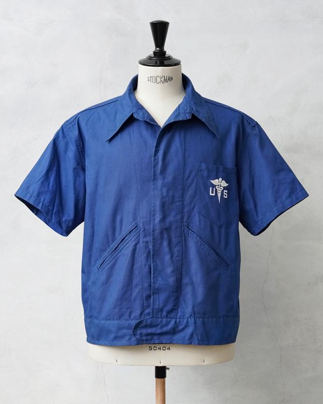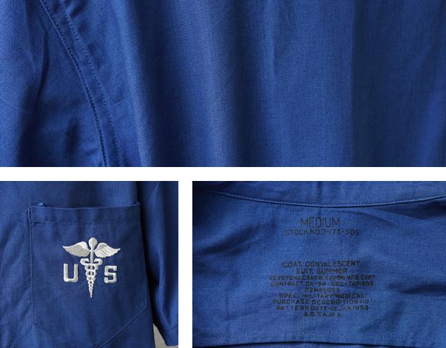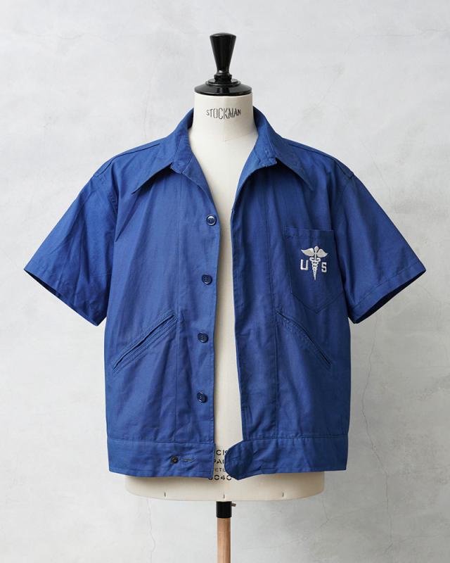 1945年に採用され、1950年代に米軍で製造された希少なヴィンテージメディカルシャツが入荷しました!制式名称は「COAT,CONVALESCENT,SUIT,SUMMER」とジャケットやコートのような名称ですが、「CONVALESCENT」と記載があるように、回復期の患者が着用するためのアイテムで、こちらは暖かい季節に使用することを目的に作られた、通気性の良いコットン素材が使用された半袖のシャツです。鮮やかなブルーが使用され、左胸のポケットにはメディカルマークのホワイト刺繍がデザインされています。前立てが2重のフライフロント(比翼仕立て)が採用されており、両玉縁のポケットがフロントに2箇所付属、ウエストの持ち出しがベルトのようになっており、ショートジャケットのような凝った作りが特徴です。