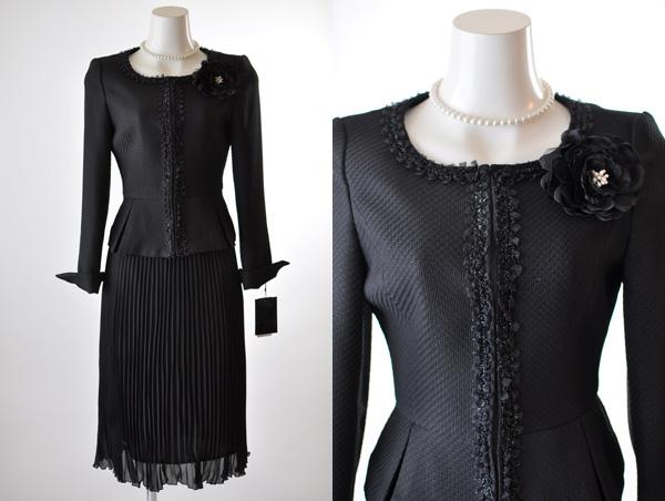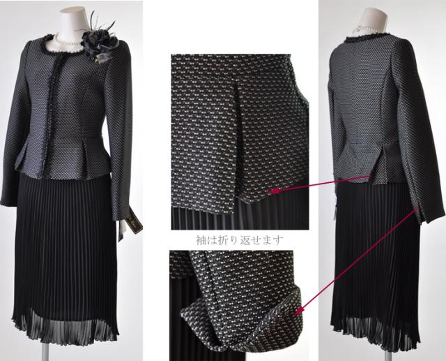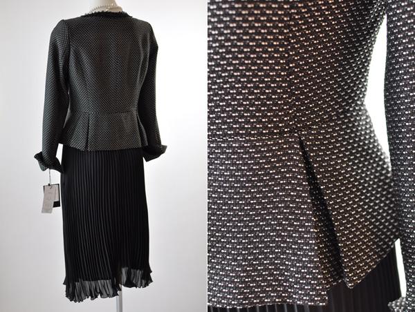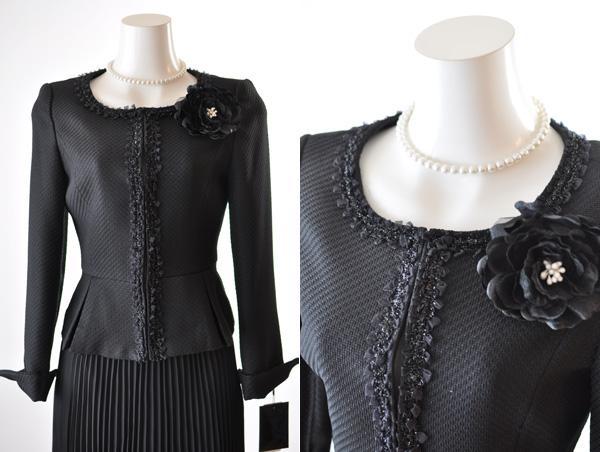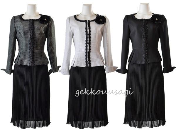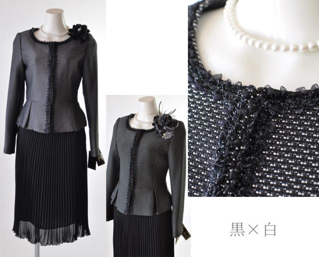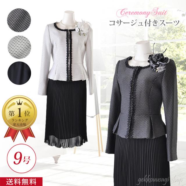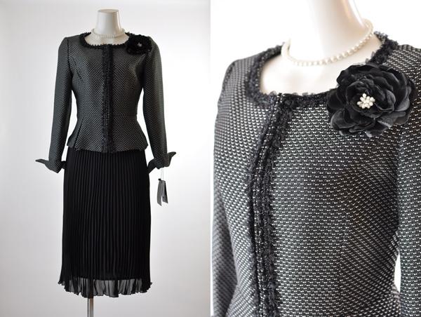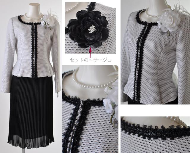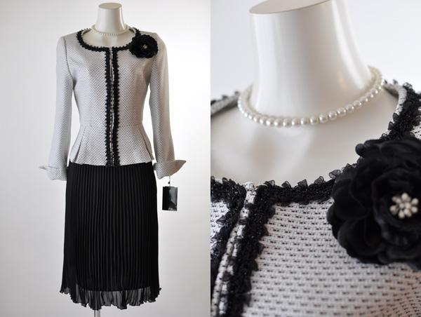 限定特価 9号 レディース フォーマルスーツ ノーカラージャケット&プリーツスカート コサージュ付 黒 白 卒業式 入学式 スーツ セレモニー 発表会 結婚式 お宮参り 顔合わせ 母 ママ ミセス 祖母 服装 コサージュ付 (b2f1y5)9375