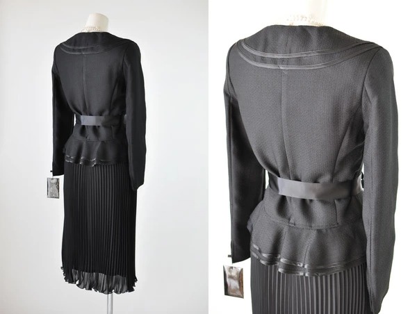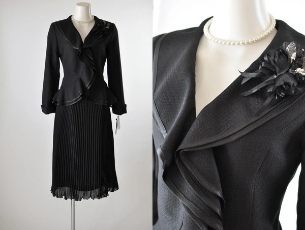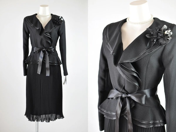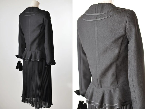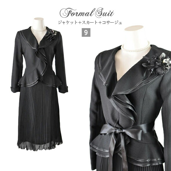 9号 レディーススーツ ダブルフリル スカートスーツ ベルト付き ひざ下丈 プリーツスカート セットスーツ 黒 カラーフォーマル セレモニー ママスーツ 卒業式 入学式 結婚式 スーツ コサージュ付 (b2f1y4/SB3)9370