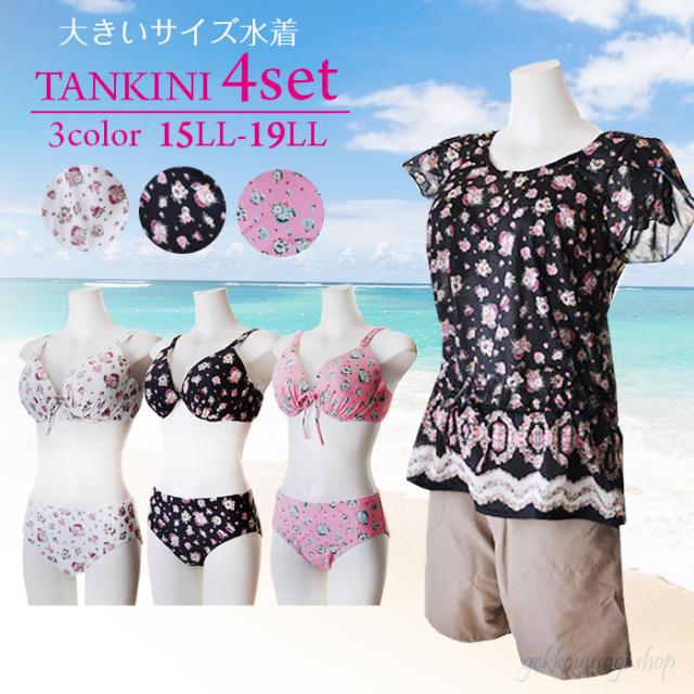 大きい 水着 大きいサイズ 15号 17号 19号 レディース 体型カバー タンキニ 着やせ お洒落 カッコイイ ビキニ ショートパンツ 4点セット ママ水着 ぽっちゃり 水着 20代 30代 40代 50代 セパレート ミセス水着 花柄 ピンク ホワイト 黒(amt)98273