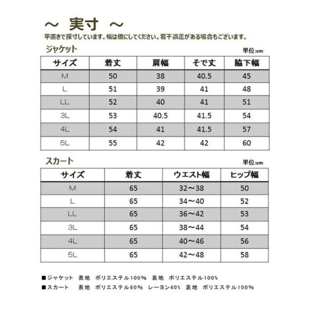 M、L、LL、3L、4L、5Lサイズのスカートスーツです。