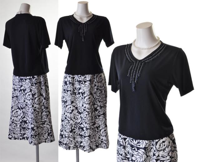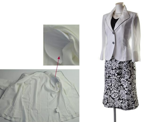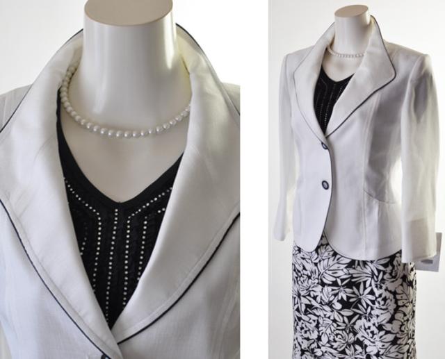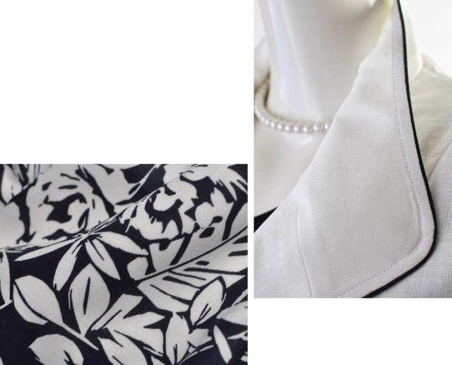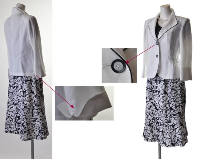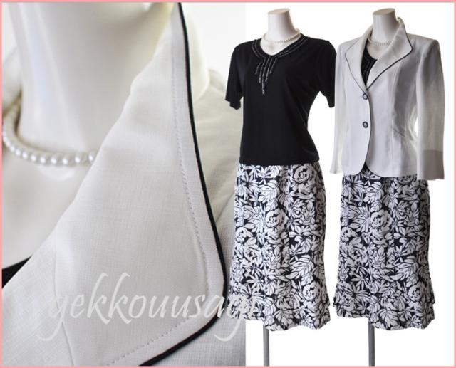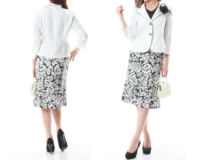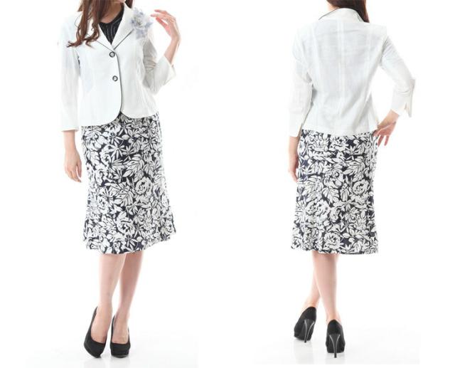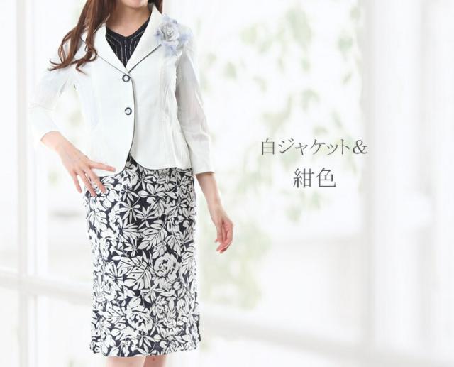 白ジャケット&紺色ベース×インナー・柄スカート、白ジャケット&黒色ベース×柄インナー・柄スカートの2パターンございます。