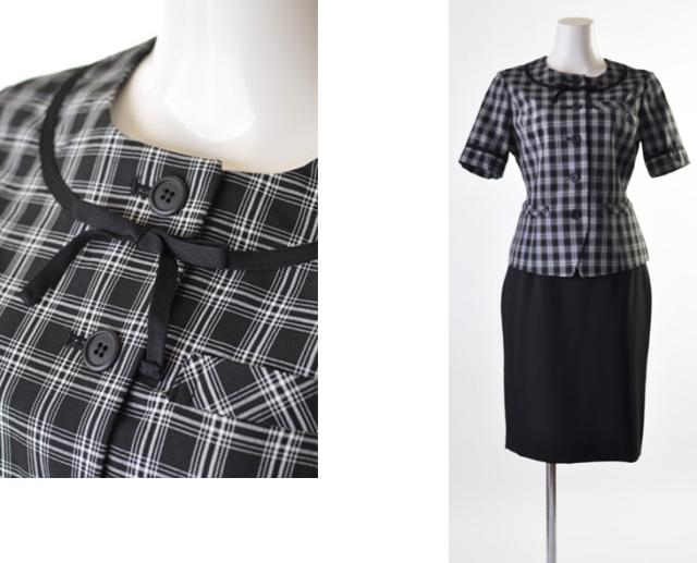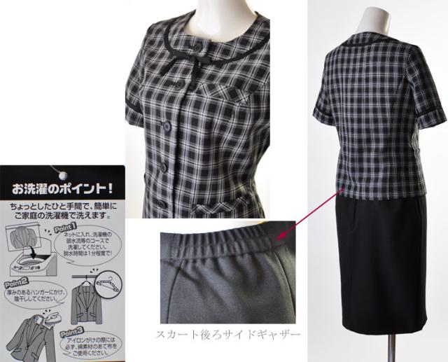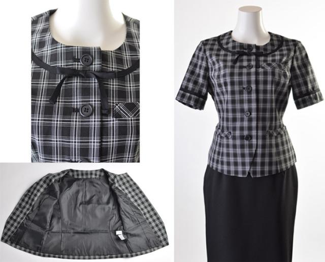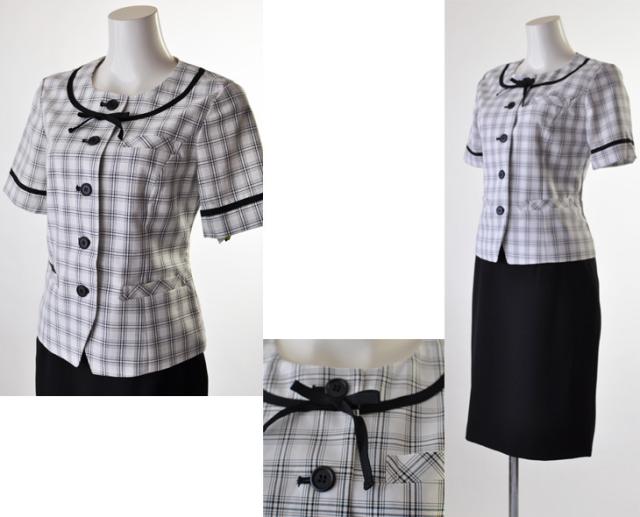 小さいサイズ 5号/7号 制服 事務服 上下セット 洗える半袖ジャケットスーツ 半袖オーバーブラウス OL サマースーツ 夏用事務服 医療事務服 チェック 格子柄 黒 白 (au2f6)1251111-wb9FNB