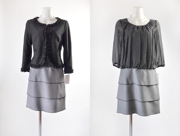 黒ジャケットには柄ワンピースとドットグレーワンピースの2パターン。