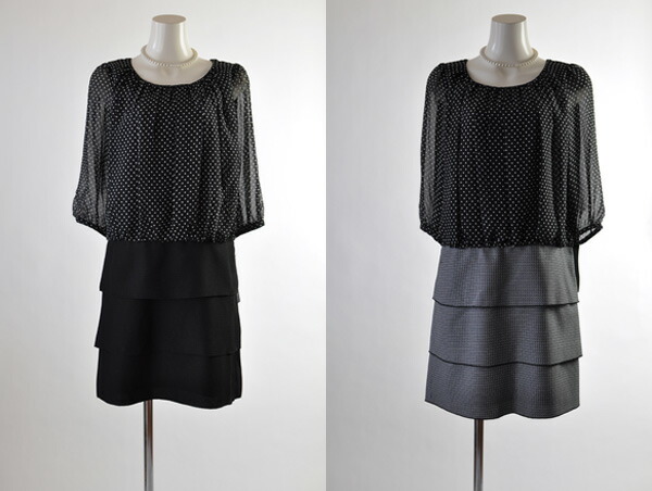白ジャケットにはドット×黒ワンピースを、黒ジャケットにはドット×グレーワンピースをセットアップしてみました。