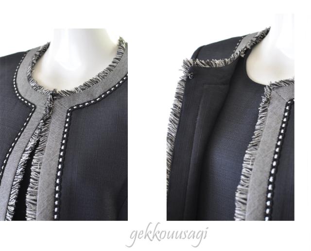 ジャケットの衿端から裾まで贅沢にぐるりと1周したフリンジとラメ入りブレードが目を引くアクセントに。