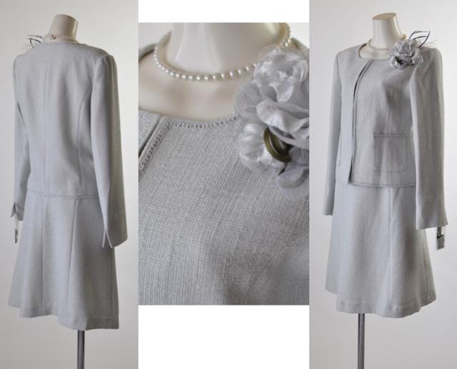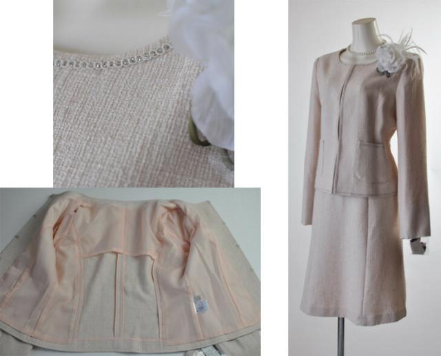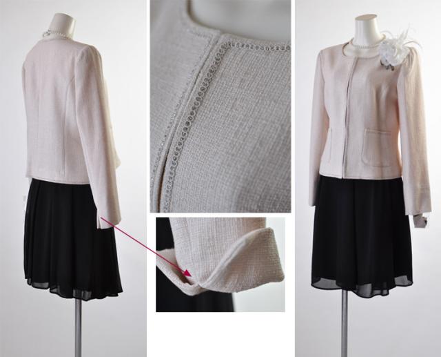 ジャケットと同素材のスカートは後ろファスナー開き、7枚ハギスカート。