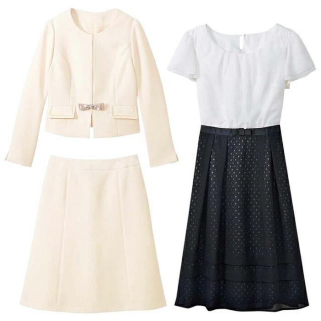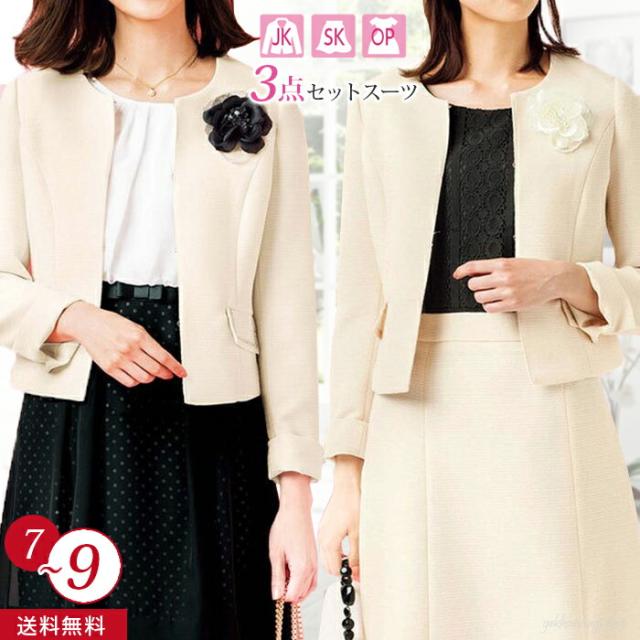 ジャケット・スカート・ワンピースの着回しに便利な3点セットスーツです。