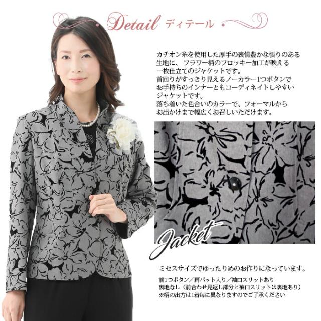 カチオン糸を使用した表情豊かな張りのある落ち着いた色合いの生地に、フロッキー柄で華やかさを添えたジャケットと、便利なブラックインナー、サイズ・デザインが自由に選べるブラックボトムスの3点がセットになったスーツです。