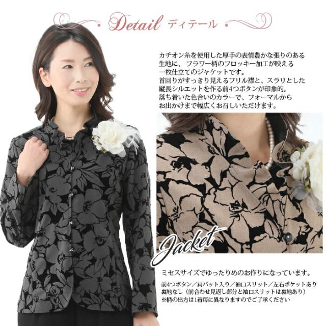 首回りのフリル襟が美しい、大きめ花柄のジャケット。
