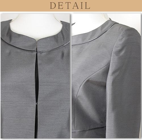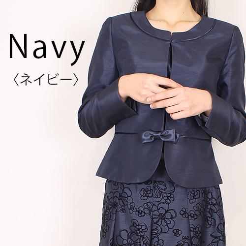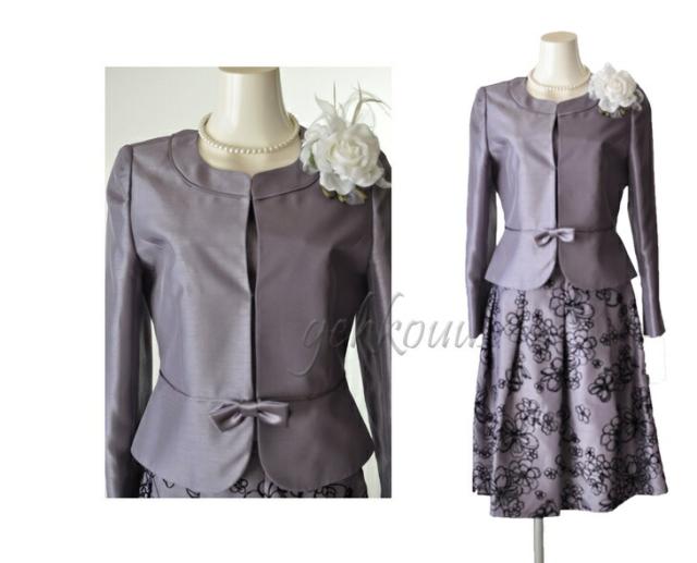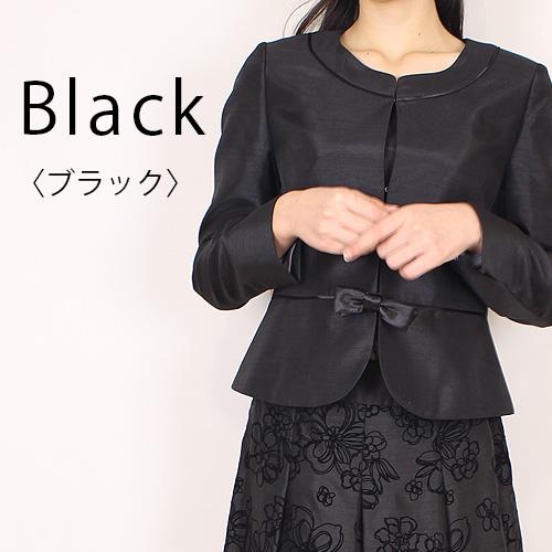 ジャケットはノーカラーペプラム切替ジャケットリボン付。