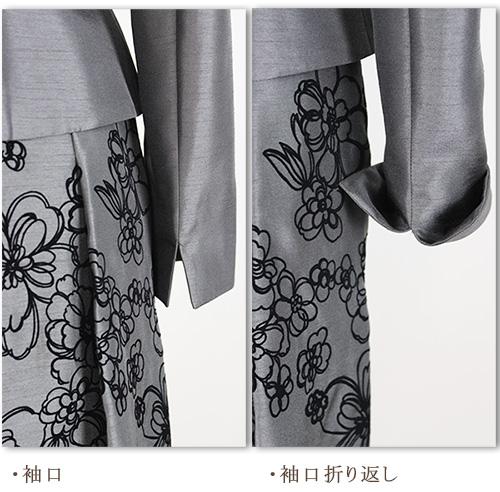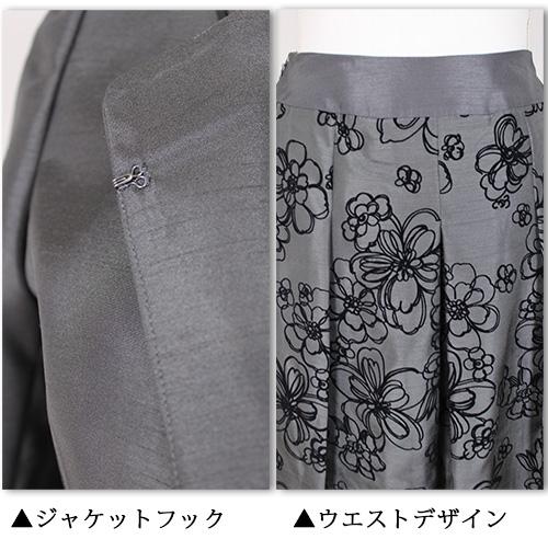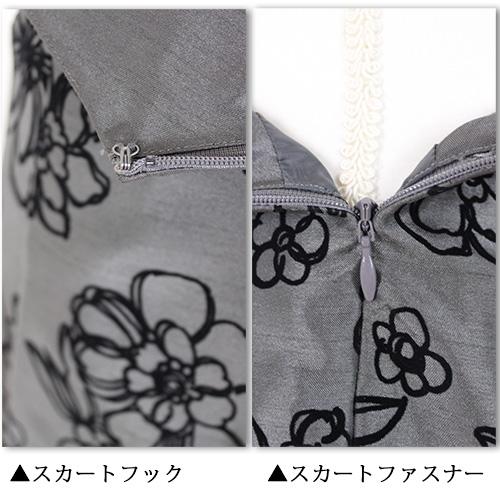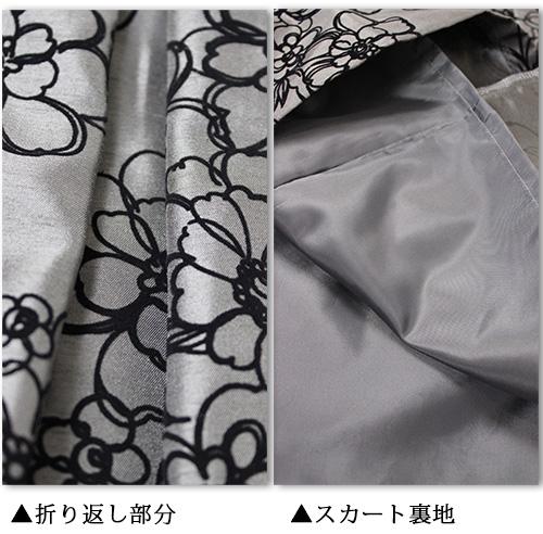 スカートは、光沢感のある上質シャンタン生地にフロッキー花柄がフェミニン。
