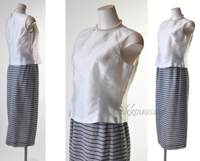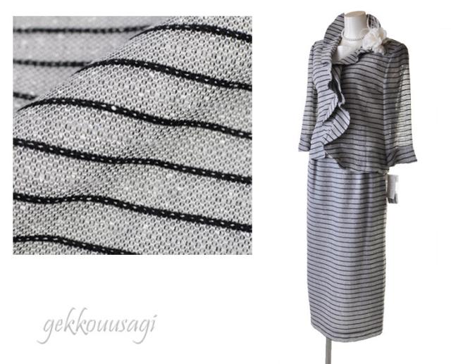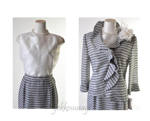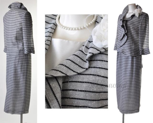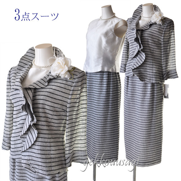 7号 グレーボーダー 3 点スーツ 七分袖 華やかフリル ラメ入 キラキラ 光沢感 ブラウス 白 ホワイト ロングスカート ひざ下 ロング丈 マキシ丈 タイトスカート スリーシーズン 20代 30代 40代 50代 60代 70代 152(am10-12)