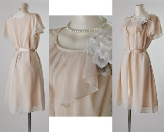 ワンピースは光沢感のある生地にシフォン素材を重ねています。