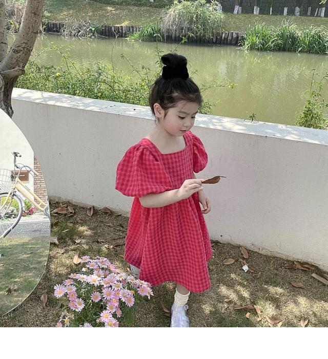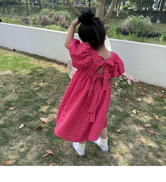 ワンピース ギンガムチェック バックリボン ワンピース 綿 ロング丈 ボリュームスリーブ チェック柄 フレア リボン バルーンスリーブ