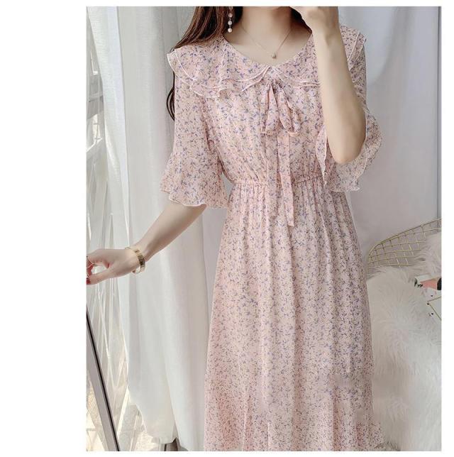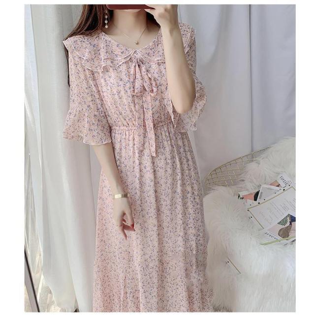 ワンピース レディース 花柄 シフォンワンピース ロング丈 フレア Aライン 半袖 ビッグカラー