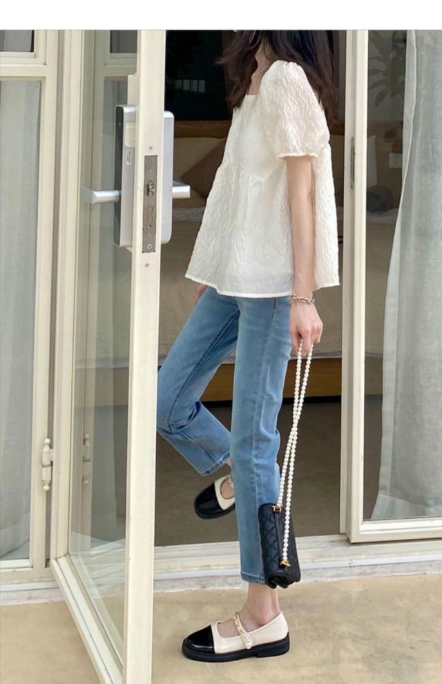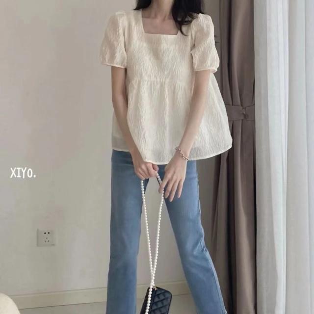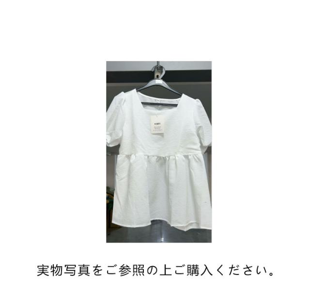 スクエアネック ブラウス レディース ジャガード 半袖 五分袖 バルーン袖 パフ袖 エンボス リボン ペプラム お洒落 送料無料