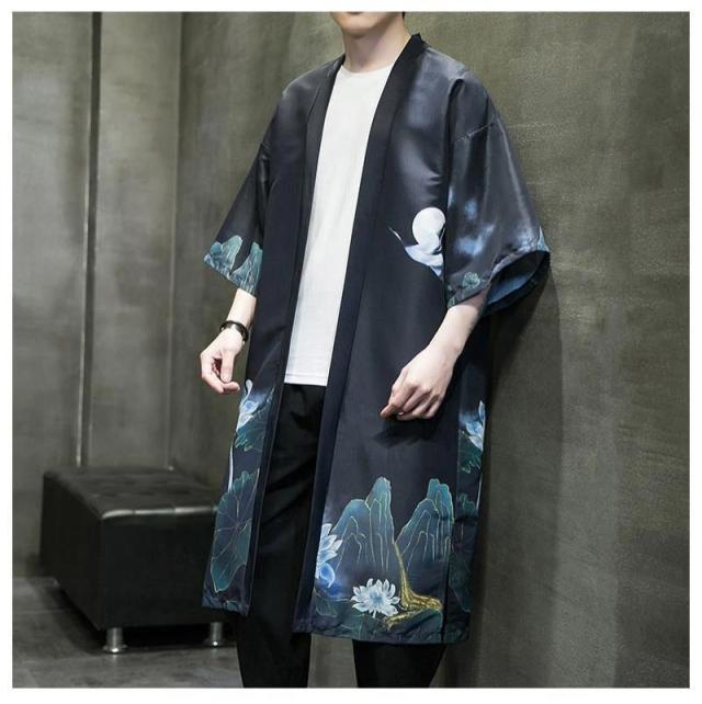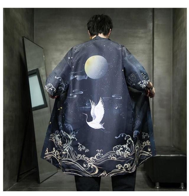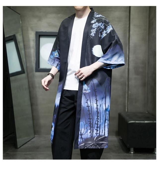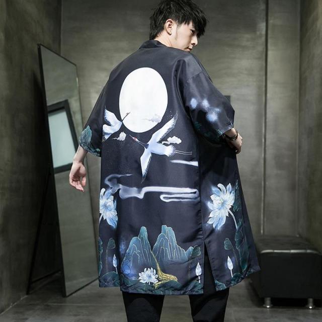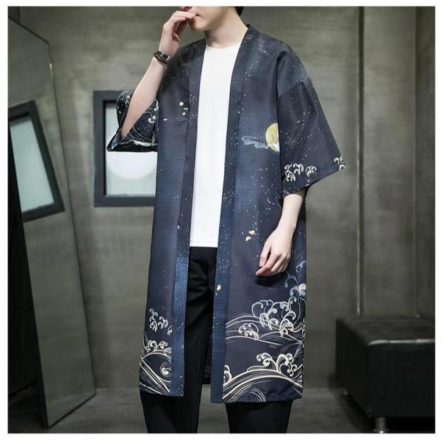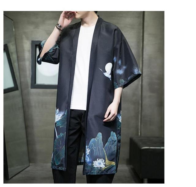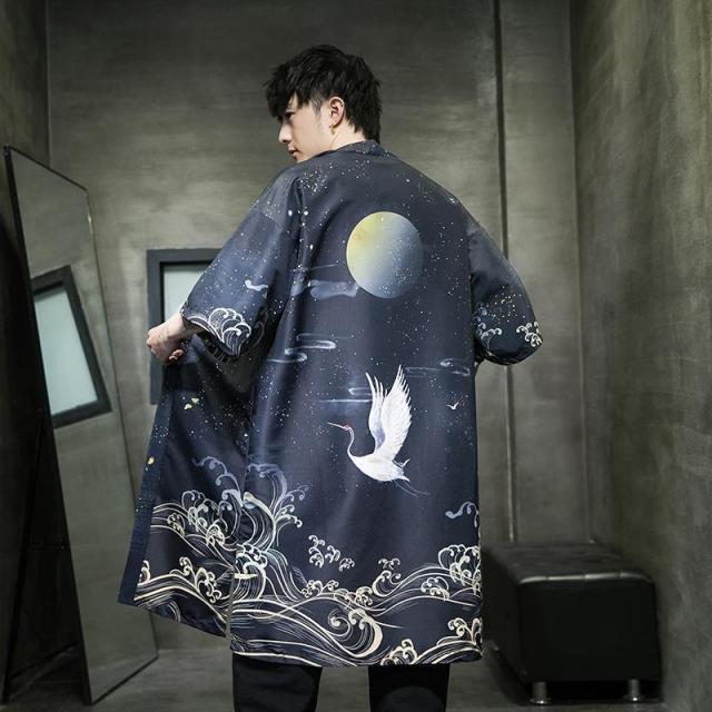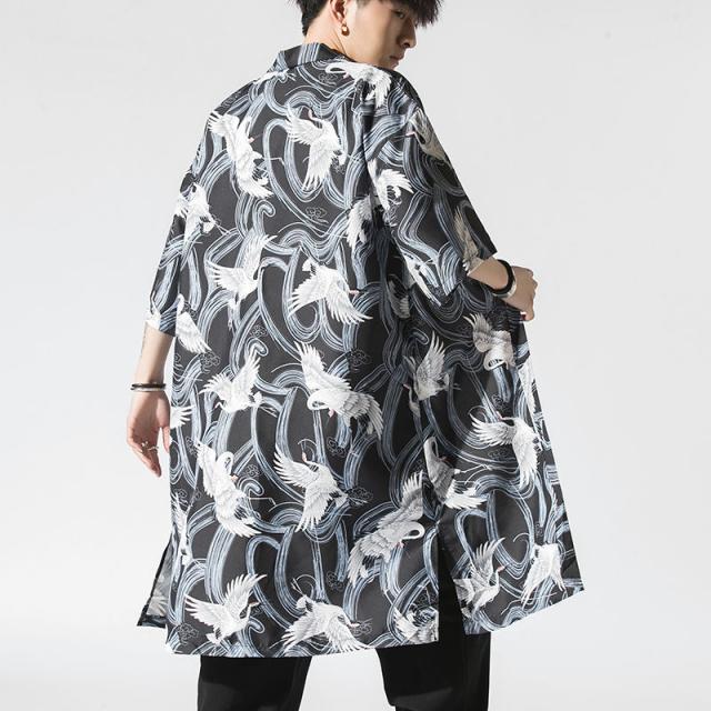 送料無料 甚平 浴衣 メンズ 鶴柄 和柄 ロング丈 薄手 涼しい ゆったり 開襟 羽織 和服風 花火大会 部屋着 ルームウェア 春夏物