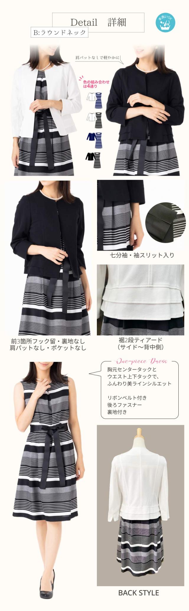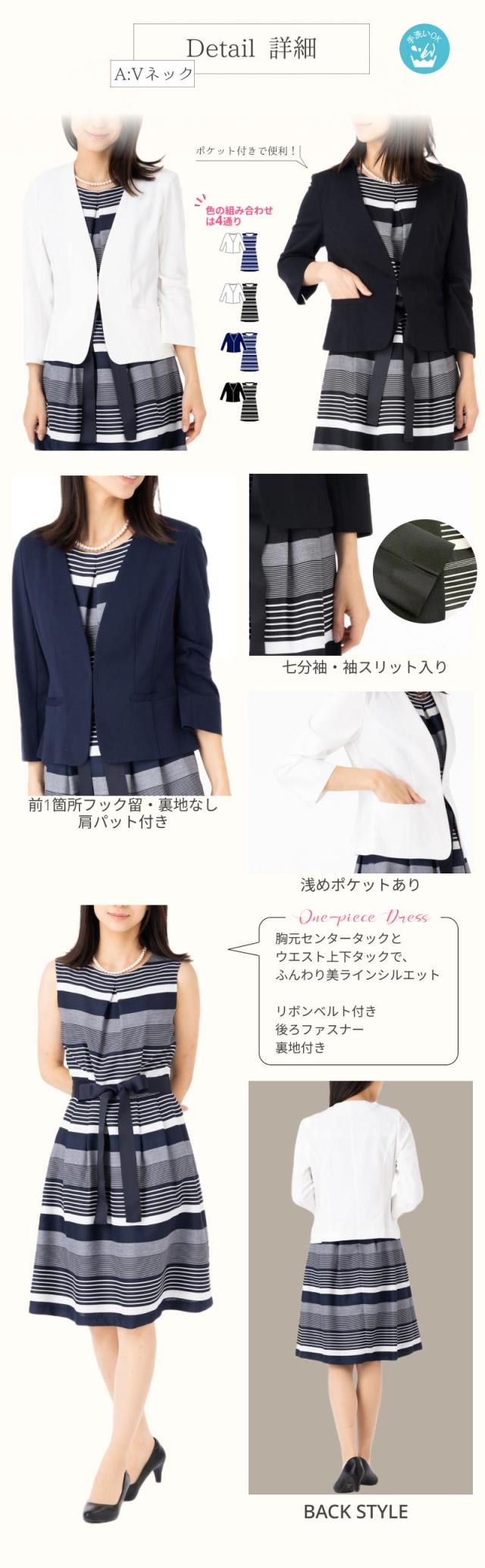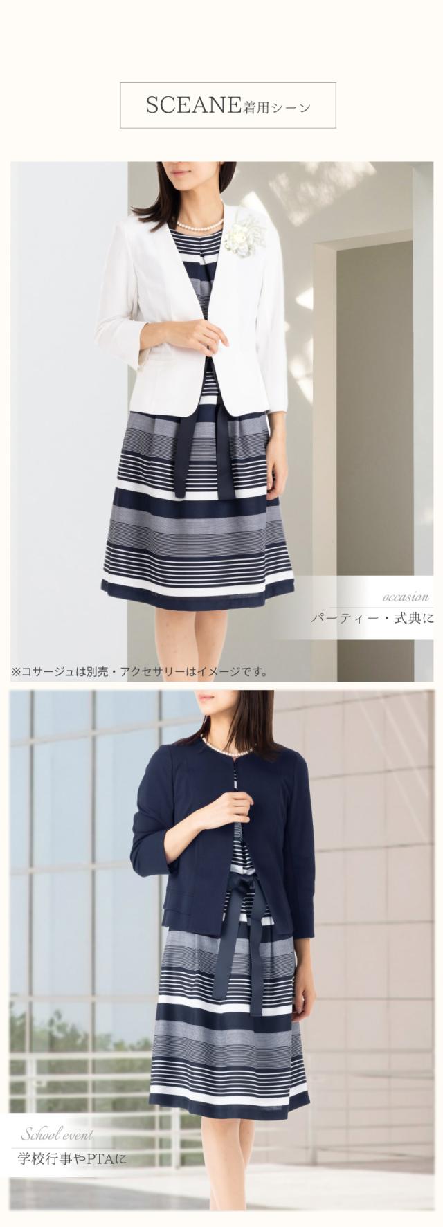 ノーカラージャケット、ワンピースとも他のボトムスやジャケットとも合わせやすく、カジュアルからフォーマルまで着回しがききます。