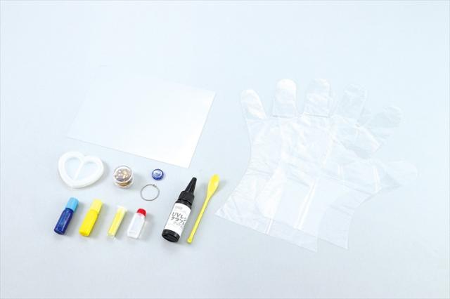 ハートのシリコン型やレジン液、キラキラのパウダーなど、必要なものは一通りセットになっているので、このキットでレジンシェイカー作りに挑戦してみよう!