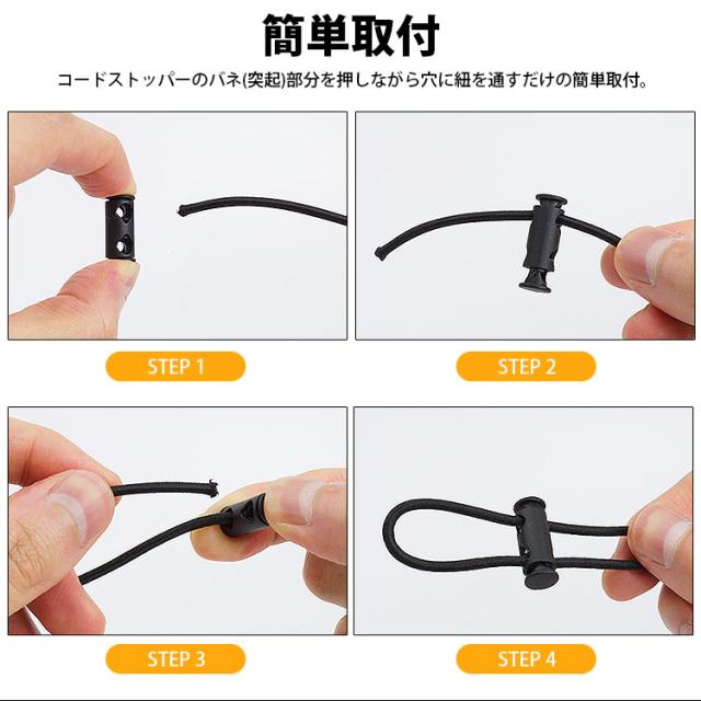 コードストッパーのバネ(突起)部分を押しながら穴に紐を通すだけの簡単取付。