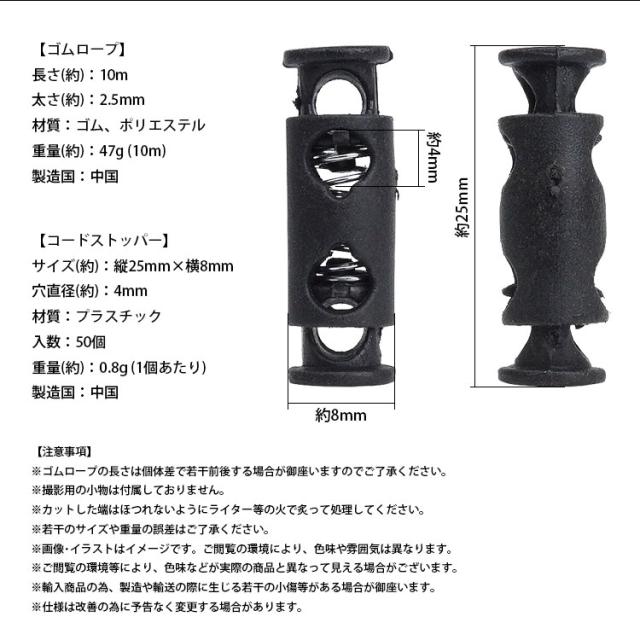 ゴムロープ 2.5mm 10m コードストッパー 穴 4mm 50個 セット ゴム紐 丸ゴム 伸縮性 カット 紐止め 手芸 アウトドア 簡単取付 PR-R2510DT50-S【メール便 送料無料】