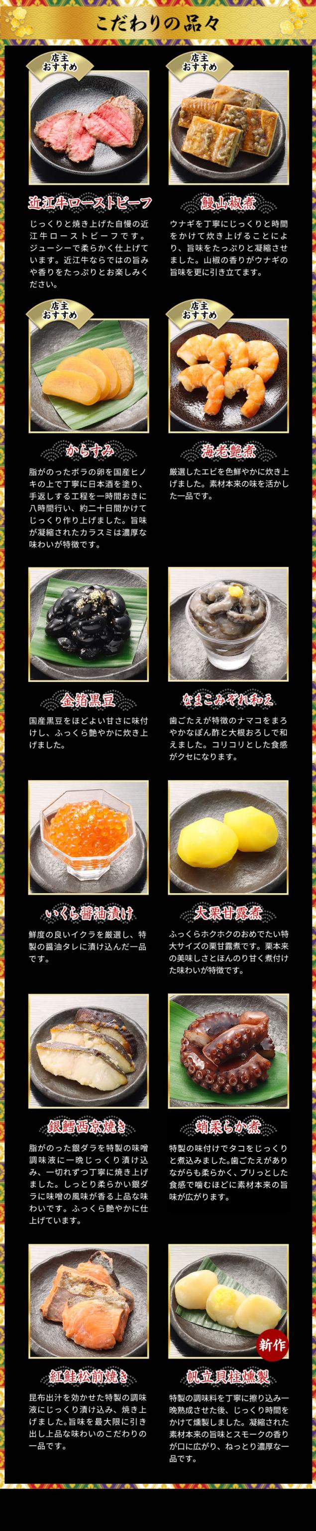 「これまでにない、最高のおせちをつくりたい。」そんな岩元の想いから誕生したのが、高級重『冠寿』です。国産の厳選素材と高級食材を惜しみなく使い、特別な調理法と繊細な盛り付けで仕上げました。たとえば、ローストビーフにはA5ランクの近江牛を使用し、しっとりとした口当たりに。海老艶煮は活きたままの特大海老を使い、鮮やかな彩りと歯ごたえを両立。さらに、からすみ・黒豆・市田柿・イクラなどの高級食材もすべて国産にこだわり、素材の持ち味を引き出しています。
