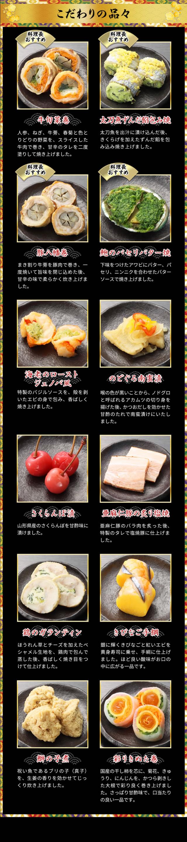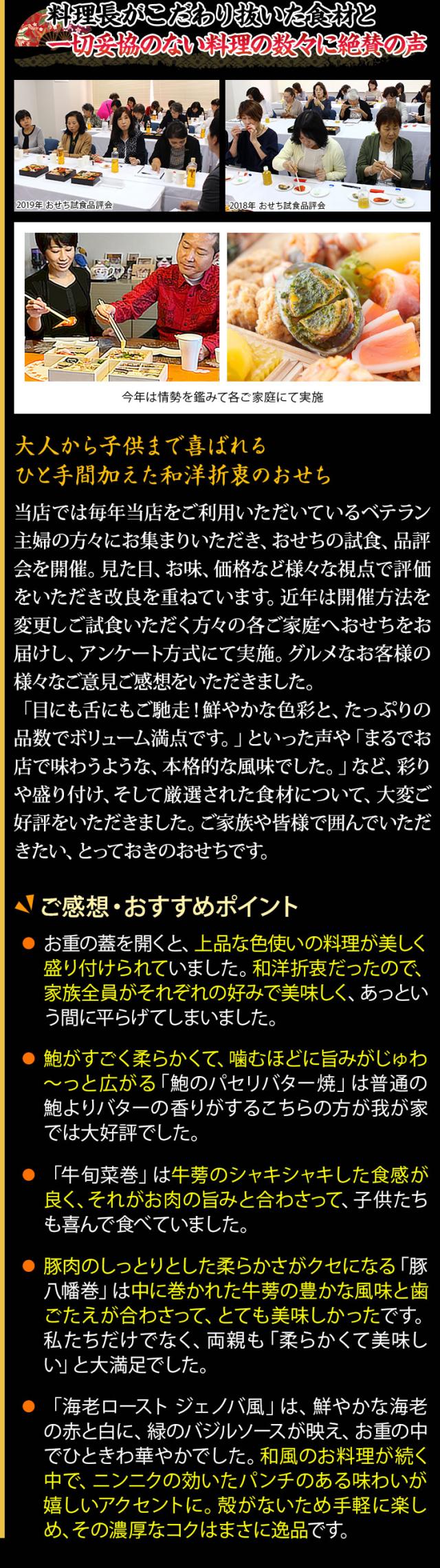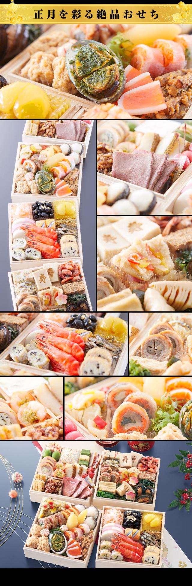 おなじみのおせち料理に加えて「のどぐろ南蛮漬け」や「ちりめん青菜炒め煮」のような国産食材をふんだんに使用することにこだわった献立が最大の特徴。"三世代の食卓を彩る家族団らんにぴったりのおせち"をコンセプトに、四つの豪華なお重には、「鮑のパセリバター焼」や「ローストビーフ」などの洋風料理も取り入れ、素材の組み合わせや調理法で、単調ではない味わいに奥行きを感じていただけます。一口食べたら止まらない、そんなおせちを目指して、伝統的な和食に、熟練の技と繊細な味付けで豊かな風味を追求しました。