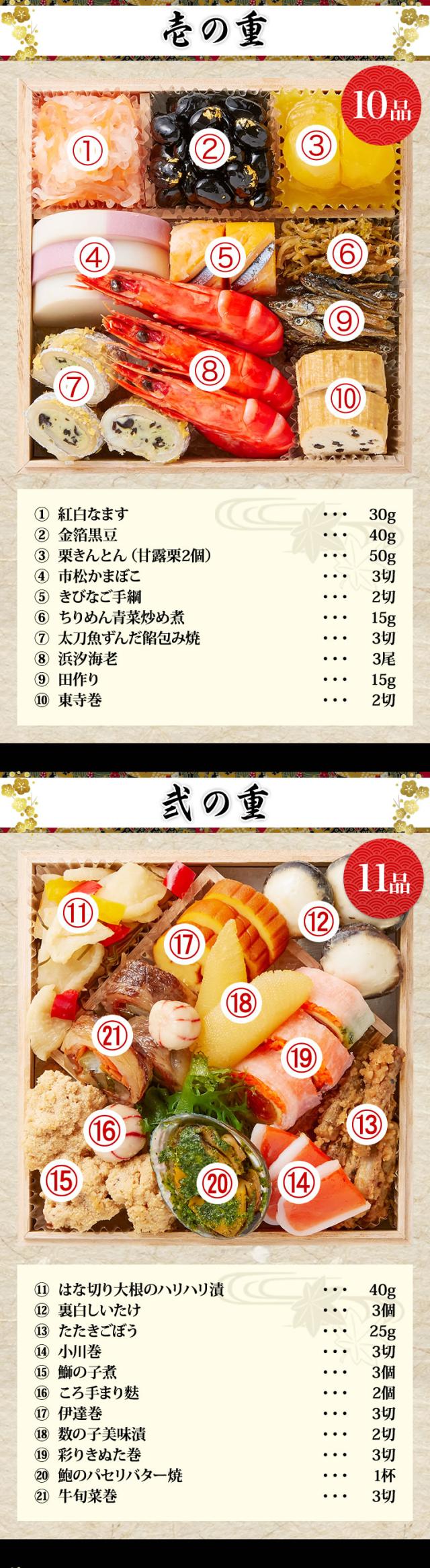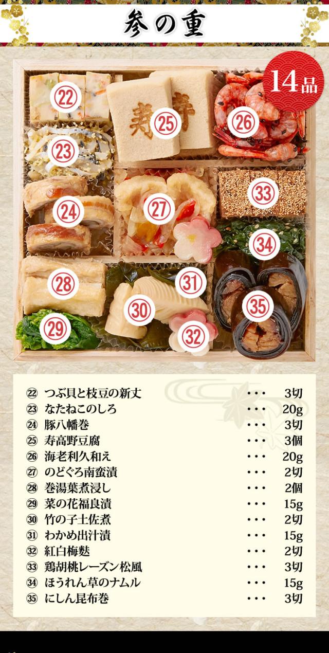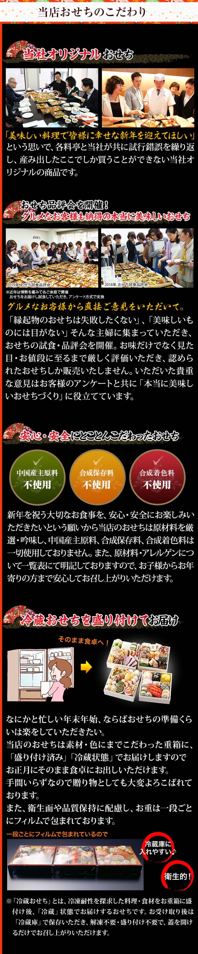おなじみのおせち料理に加えて「のどぐろ南蛮漬け」や「ちりめん青菜炒め煮」のような国産食材をふんだんに使用することにこだわった献立が最大の特徴。"三世代の食卓を彩る家族団らんにぴったりのおせち"をコンセプトに、四つの豪華なお重には、「鮑のパセリバター焼」や「ローストビーフ」などの洋風料理も取り入れ、素材の組み合わせや調理法で、単調ではない味わいに奥行きを感じていただけます。一口食べたら止まらない、そんなおせちを目指して、伝統的な和食に、熟練の技と繊細な味付けで豊かな風味を追求しました。