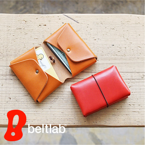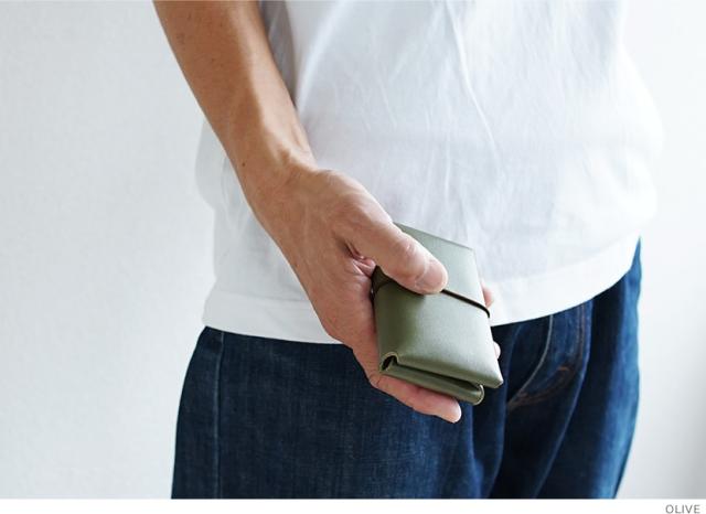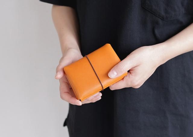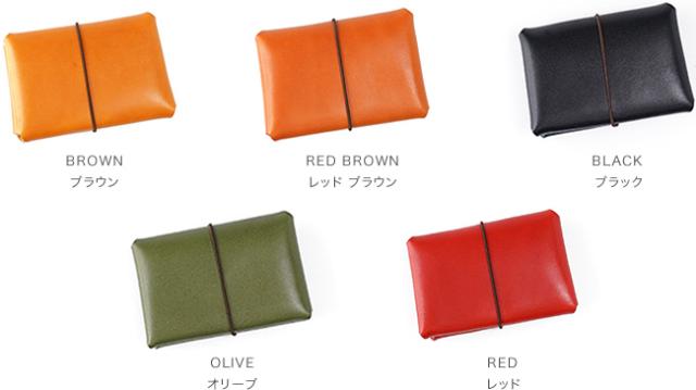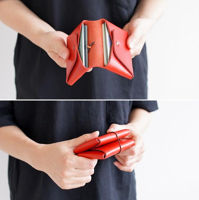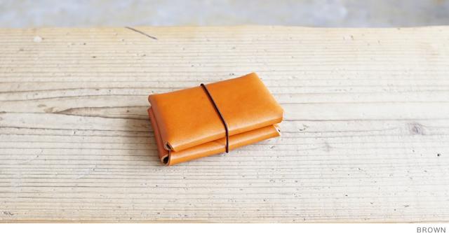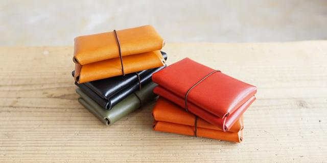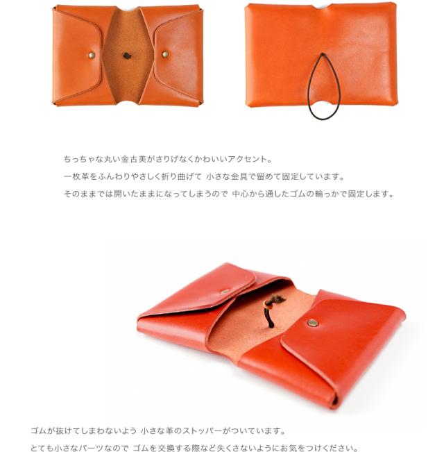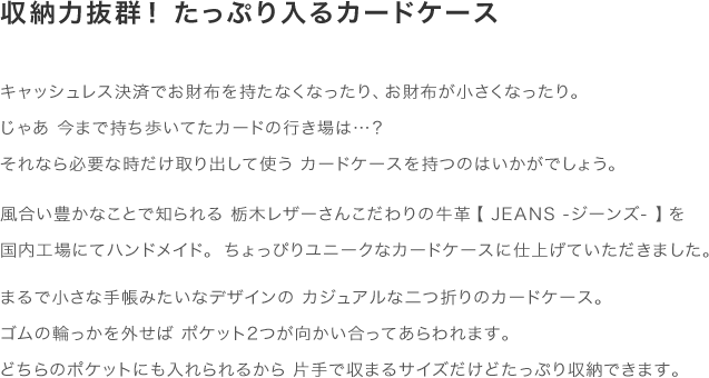 まるで小さな手帳みたいなデザインの カジュアルな二つ折りのカードケース。ゴムの輪っかを外せば ポケット2つが向かい合ってあらわれます。